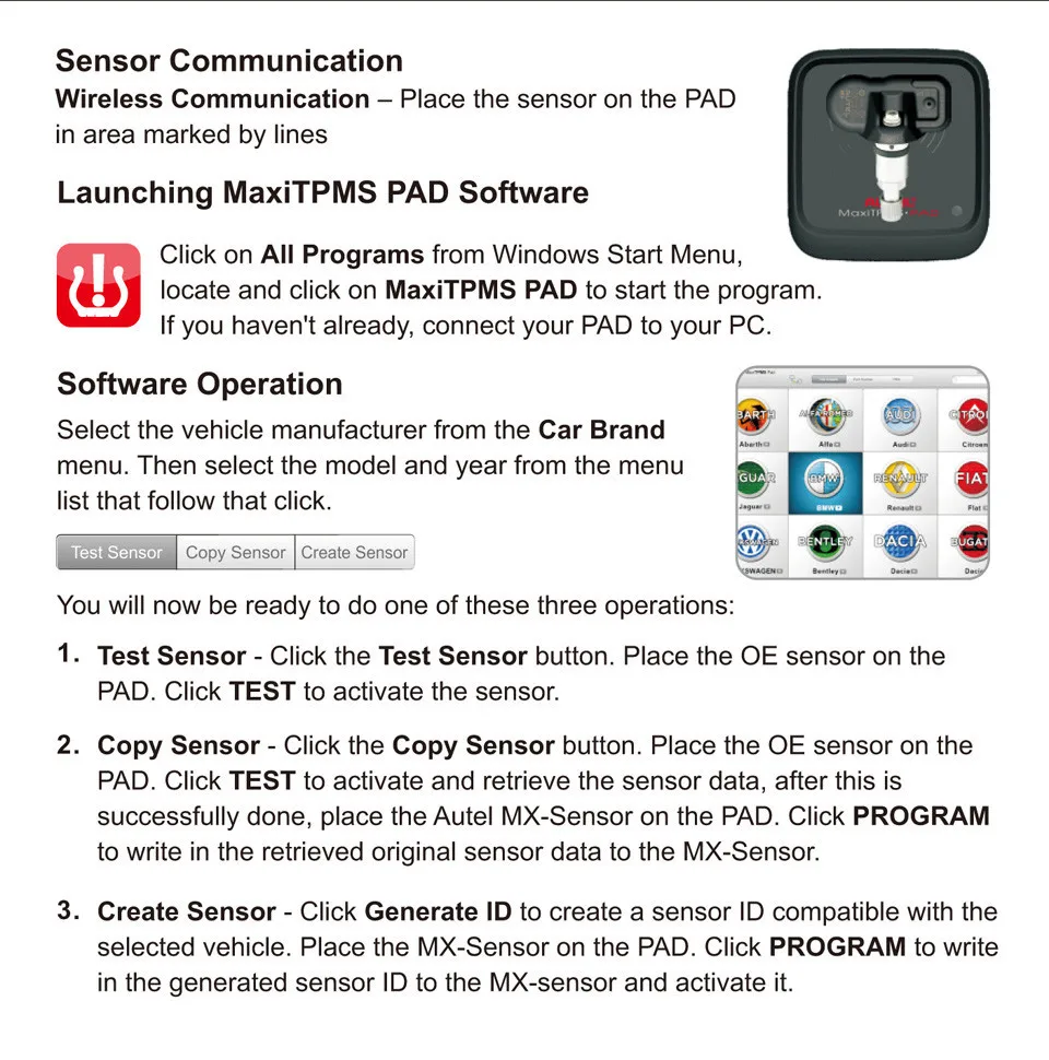 1. Загрузите программное обеспечение на ПК. 2. Подключите панель к ПК. 3. Программа MX-Sensor. Этот новый инструмент программирования является лучшим партнером для активных магазинов, так как он высвободит ваши инструменты активации TPMS, и является чрезвычайно простым в использовании и быстрым!
