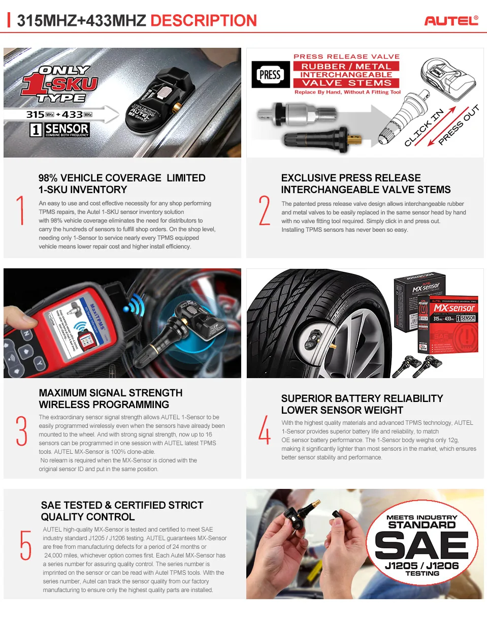Универсальные mx-датчики Autel с металлическим стержнем 433 МГц 315 МГц обеспечивают покрытие транспортных средств последней модели, так как эти датчики TPMS быстро обновляются во время установки с помощью инструмента беспроводного программирования Autel. Только два типа датчиков покрывают 98% всех OE датчиков на рынке и имеют возможность клонирования ID без необходимости повторного обучения датчика.