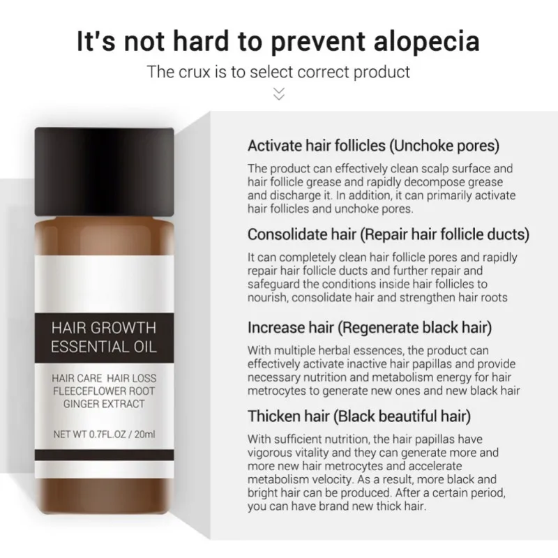 Описание:* 100% Бренд новый Высокое качество!* Высокий уровень стресса, задержка, неправильные привычки жизни, Генные и другие причины могут привести к выпадению волос. Волосы являются символом здоровья человека, но и важным представителем образа человека. С черными и густыми волосами, все жаждут.* Продукт содержит ингредиенты для роста волос, такие как корень fleeceflower и экстракт имбиря, который оказывает мощное влияние на рост волос.* Стимулирует волосяные фолликулы, ускоряет кровообращение кожи головы, стимулирует рост волосяных фолликул, препятствует выпадению волос.* Контроль масла, удаление перхоти, питает кожу головы, помогает волосам расти, предотвращает выпадение волос.* Восстанавливает волосяные фолликулы, укрепляет корни волос, Уменьшает выпадение волос, улучшает повреждение и сушит волосы, делает волосы гладкими и эластичными и легко расчесываются.* Эфирные масла для роста волос подходят как для мужчин, так и для женщин, делая ваши волосы все более и более, больше не страдали от меньшего количества волос и выпадения волос, не нужно беспокоиться о странном глазу других людей.Характеристики:Тип: эфирное масло для роста волосТип волос: все типы волос sВес нетто: 20 млОсобенности: рост волос, против выпадения волосСтрана/регион производства: КитайИнгредиент: корень Fleeceflower, экстракт имбиряПол: унисексВозрастная группа: взрослыйПосылка включает в себя:1 x эфирное масло для роста волосКак использовать:1. Добавьте 3 мл эфирного масла на 100 мл шампуня, Вымойте волосы после равномерного смешивания.2. Возьмите 4-5 капель эфирного масла, смешанных с шампунем на руке, а затем Вымойте волосы.3. После мытья волос и когда волосы будут сухими, нанесите небольшое количество эфирного масла на волосы и массируйте, чтобы повысить поглощение.