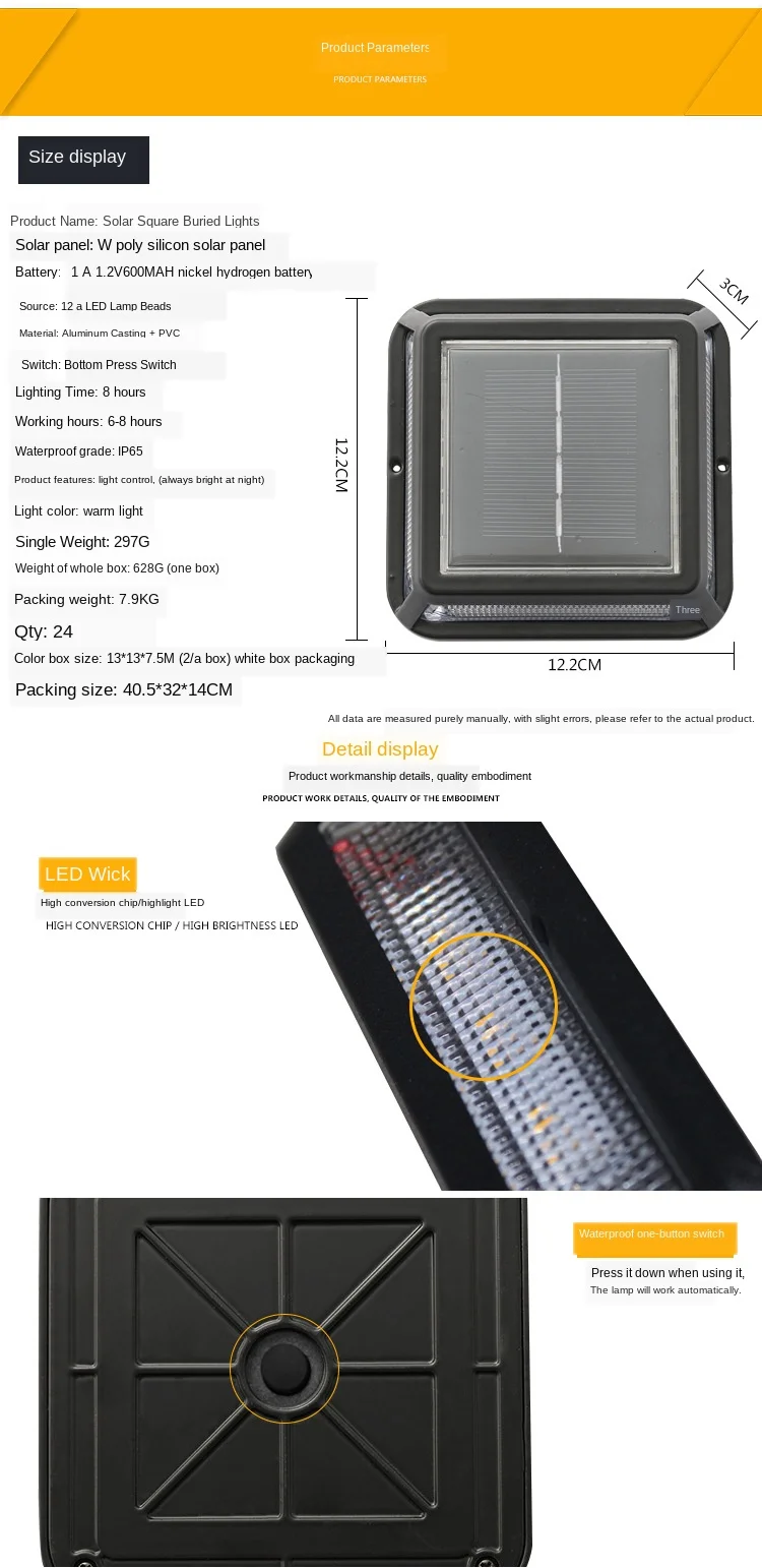 Название продукта: солнечный 12LED внутренний двор квадратный пол Лампа Солнечные панели: 2 в 100 мА Емкость аккумулятора: 600 мАч Ni-MH Время зарядки: 8 часов освещения Режим работы: оптически управляемая индукция + механический переключатель Количество бусин: 12 светодиодов Способ упаковки: 2 коробки Размер упаковочной коробки: 120*120*130 мм