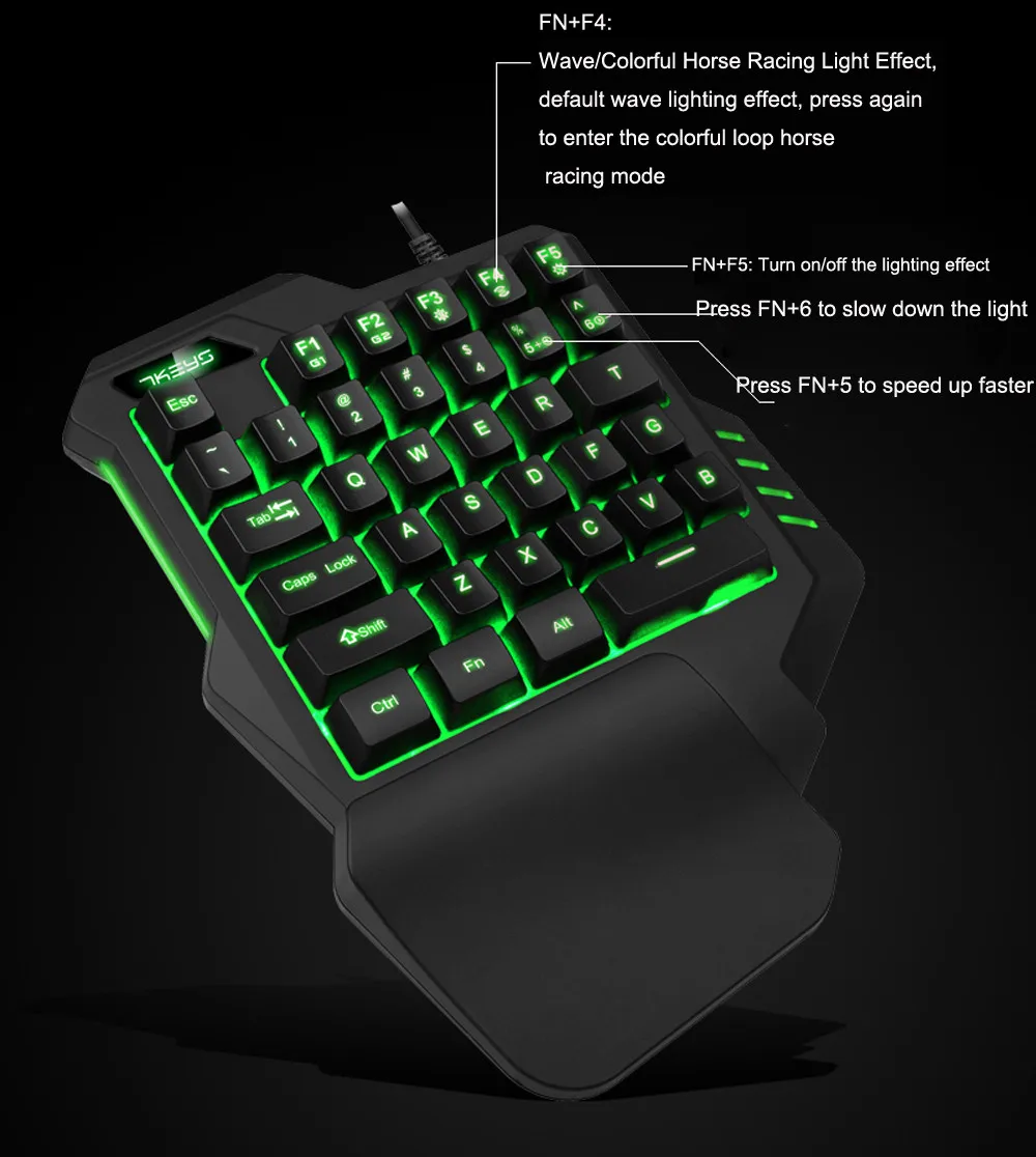 Идеально подходит для операционной привычки геймеров, эта игровая клавиатура G30 поможет вам быстрее побить конкурентов в играх.Он предназначен для игр, особенно для тех, кто любит использовать одну руку для управления клавиатурой в экшн-играх для быстрого движения.Эргономичная форма с комфортным отдыхом на ладони, светодиодный Радужный Подсветка делает его удивительной игровой клавиатурой.Особенности с первого взгляда:Светодиодный фонарик обеспечивает отличное визуальное наслаждениеБолее быстрые реагирующие клавиши дают удовлетворительное ощущениеС большой накладкой на запястье, уменьшает усталость ваших рук1,6 М прочный волоконный кабель и высококачественное основание ABSСовместимость с Windows 98/2000/XP/Vista/7, Android, iOSСпециальный режим для игрВозьмите свой игровой опыт на следующий уровень с игровой клавиатурой G30, эта клавиатура с одной рукой имеет всего 35 основных клавиш для игрПортативный и удобныйВы можете носить его везде, где хотите, отлично подходит для управления одной рукой. Легкий доступ к выделенным мультимедийным элементам управления, удобно и легко переключаться между играмиУдобный дизайнИзготовлен и разработан, чтобы адаптироваться к естественным сложностям и движениям ваших рук и пальцев. Большой коврик для запястья позволяет выдерживать длительные Часы онлайн-игрыМатериал из АБС-пластикаТип клавиатураПодключение проводногоИнтерфейс USB 2,0Цифровой код 35Срок службы клавиатуры (раз) 8 миллионов разОтвет Скорость 8 мсКлавиатура Тип мембранная клавиатураБатарея информацияРазмер и ВесРазмер посылка (Д x Ш x В) 23,10x18,80x4,00 см/9,09x7,4x1,57 дюймовПосылка весом 0,3850 кгРазмер продукта (Д x Ш x В) 22,70x17,00x3,60 см/8,94x6,69x1,42 дюймовВес изделия 0,3350 кгПосылка содержание