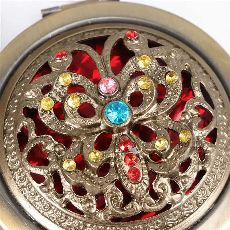 Это портативное зеркало для макияжа с цветочным узором, которое изготовлено из прочного цинкового сплава. Он имеет двухсторонние зеркала и принимает складной дизайн, легко взять его в карман или сумочку.