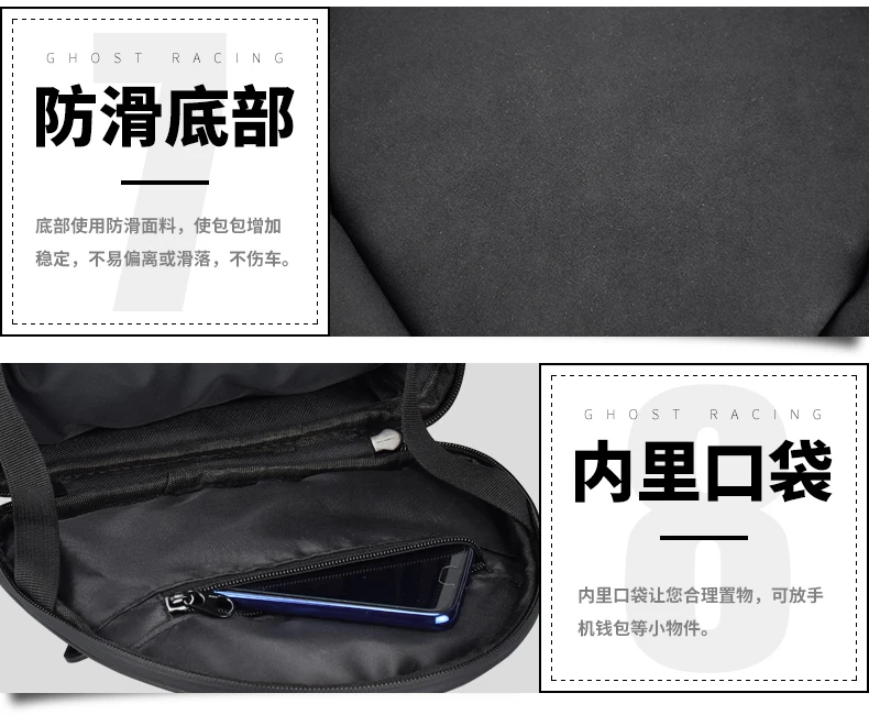 5. Широкое применение: для большинства мотоциклов, вы можете хранить такие предметы, как кошельки, мобильные телефоны, комнаты, энергетические напитки, сигареты и т. д. (не может хранить шлемы).