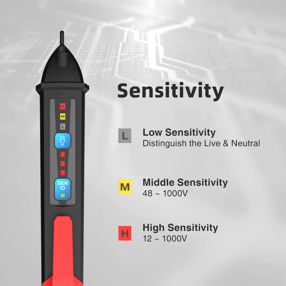 С функцией регулировки чувствительности вы можете выбрать 12-1000 В переменного тока или 48-1000 В переменного тока (ситуация по умолчанию), таким образом, вы можете использовать тестер вольт, не беспокоясь, что он будет делать шум без работы Просто установите кнопку регулировки чувствительности для регулировки чувствительности (низкий, средний, высокий) для измерения напряжения (48 В-1000 В в ситуации по умолчанию до 12 В-1000 В)