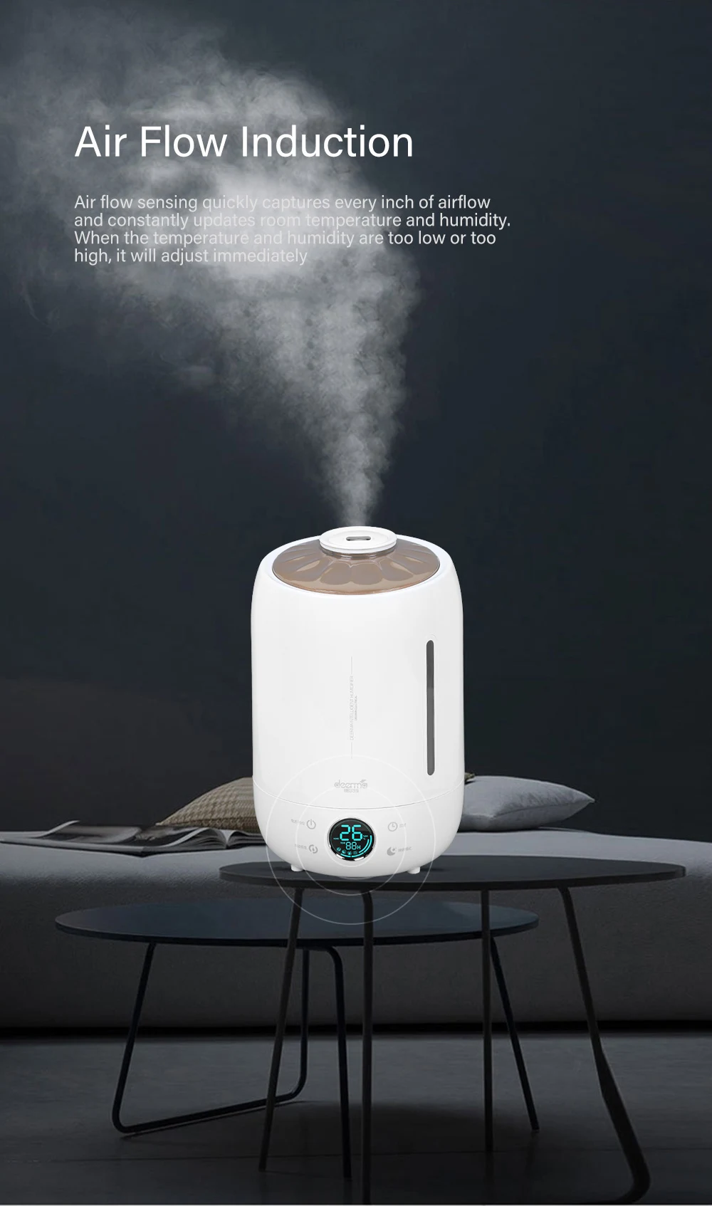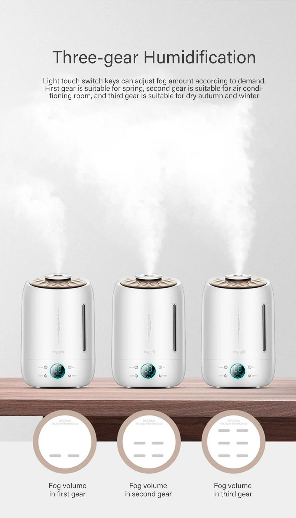 Тактильная клавиша переключения света может регулировать количество тумана в соответствии с требованиями. Первая передача подходит для весны, вторая передача для кондиционера и третья передача для сушки осенью и зимой.