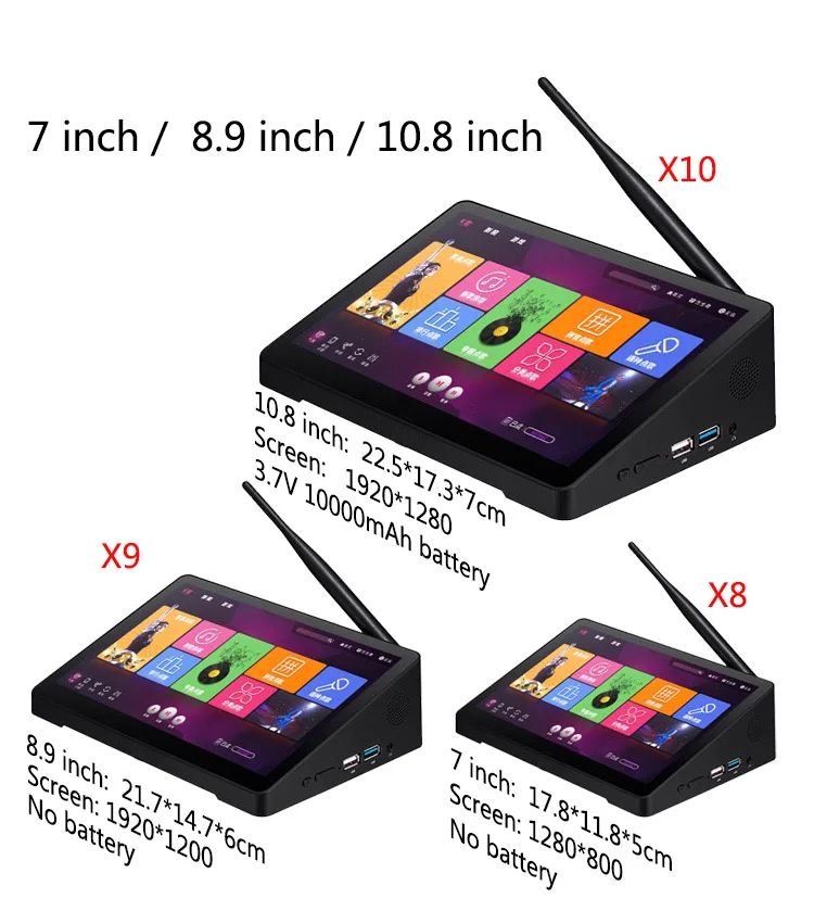X8:7 дюймов 1280*800 IPS;X9:8,9 дюймов 1920*1200 IPS;X10:10,1 дюймов 1920*1280 IPS