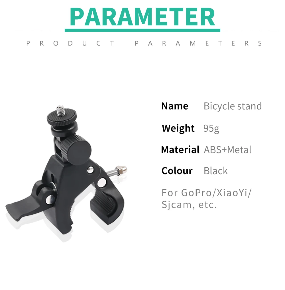 1. Крепление для велосипеда 2. Цвет: черный 3. Материал: АБС-пластик 4. Размер упаковки: около 15*15 см/5,91 * 5.91in 5. Функция: Отпустите руки, фиксированная камера движения 6. Применимо: для большинства спортивных камер GoPro