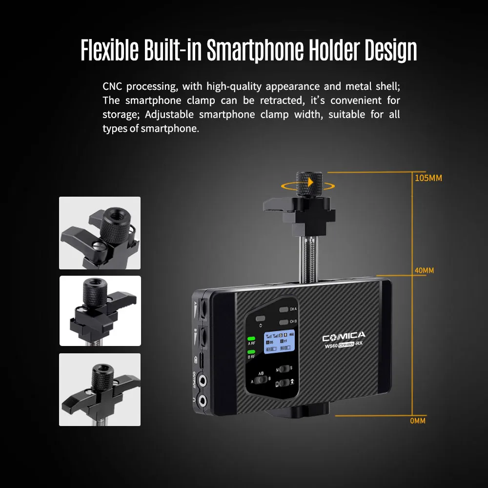 WS60 COMBO-это гибкий мини-беспроводной микрофон UHF 1-Trigger-2, который заряжается тремя батареями AAA. Он использует UHF беспроводную технологию FM и ЖК-экран с высоким разрешением и интегрирован в LCF, переключатель S/M, переключатель режима смартфона/камеры и другие функции. В то же время высококачественный микрофон оснащен сильным защитой от шума, что соответствует уровню вещания.