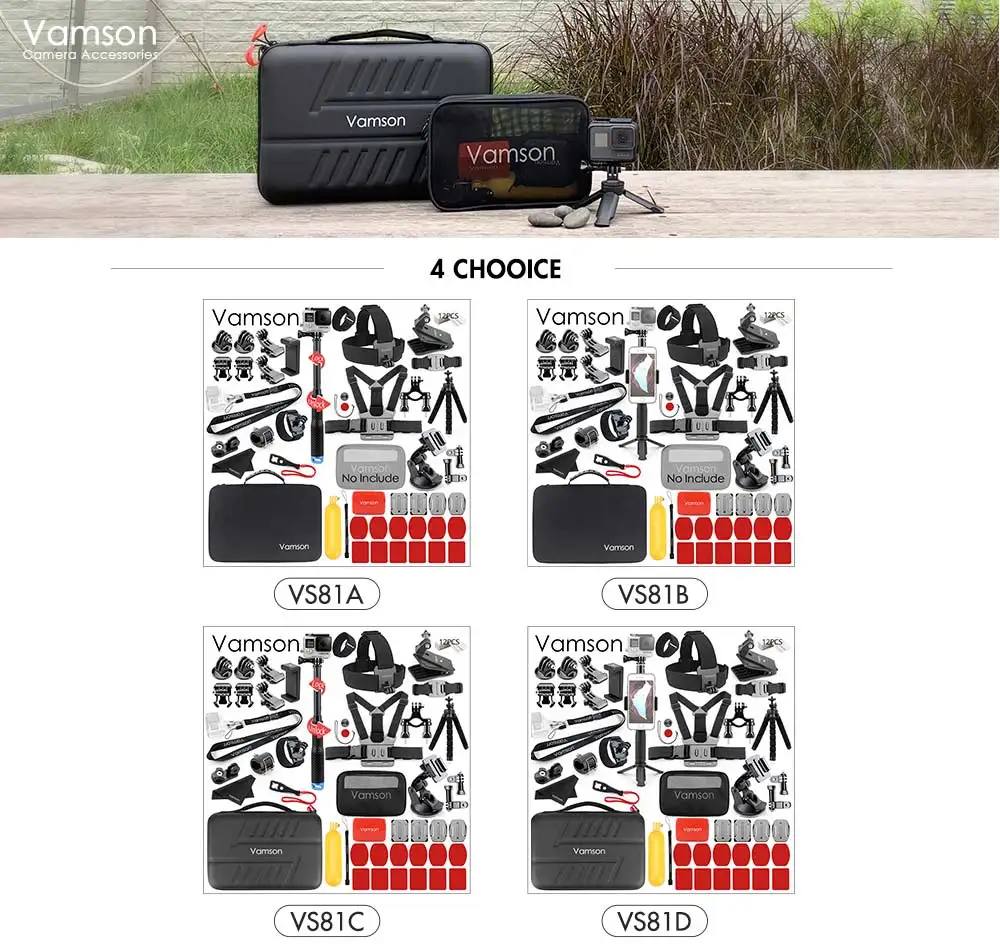 В: для каких экшн-камер подходит? A: совместимость для gopro hero 7 6 5 4 3 2 1/для Xiaomi yi 1/yi 2 /yi 4k/yi 4k +/yi lite/для SJCAM SJ4000 SJ5000 SJ6000 SJ7000/для экшн-камера DJI OSMO/для EKEN/SOOCOO/SONY и большинства экшн-камер Q: В комплект входит камера? A: не включает в себя камеру/пульт дистанционного управления/водонепроницаемый чехол с корпусом, доступно несколько вариантов, что входит в комплект VS81A / VS81B ---- старая сумка для переноски VS81C / VS81D ---- новая сумка для переноски