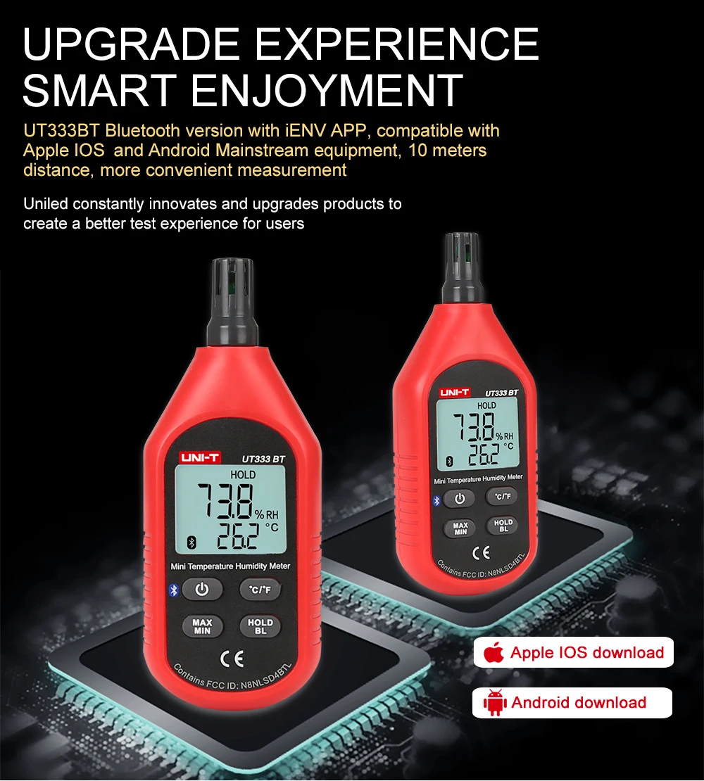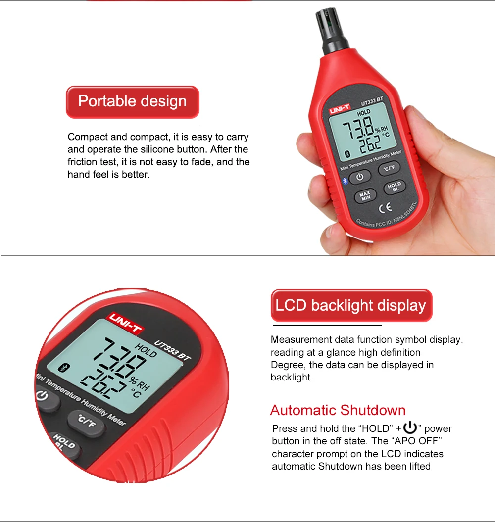 UT333BT-это стабильный, безопасный и надежный мини-цифровой термометр и гигрометр. Он имеет новую функцию связи Bluetooth и более удобен в использовании. Он широко используется для хранения и транспортировки зерна, управления файлами, управления материалом, сельского хозяйства, лесоводства и животноводства. Измерение температуры и влажности и мониторинг в таких отраслях, как здравоохранение, Обучающие эксперименты, общественные и домашние среды