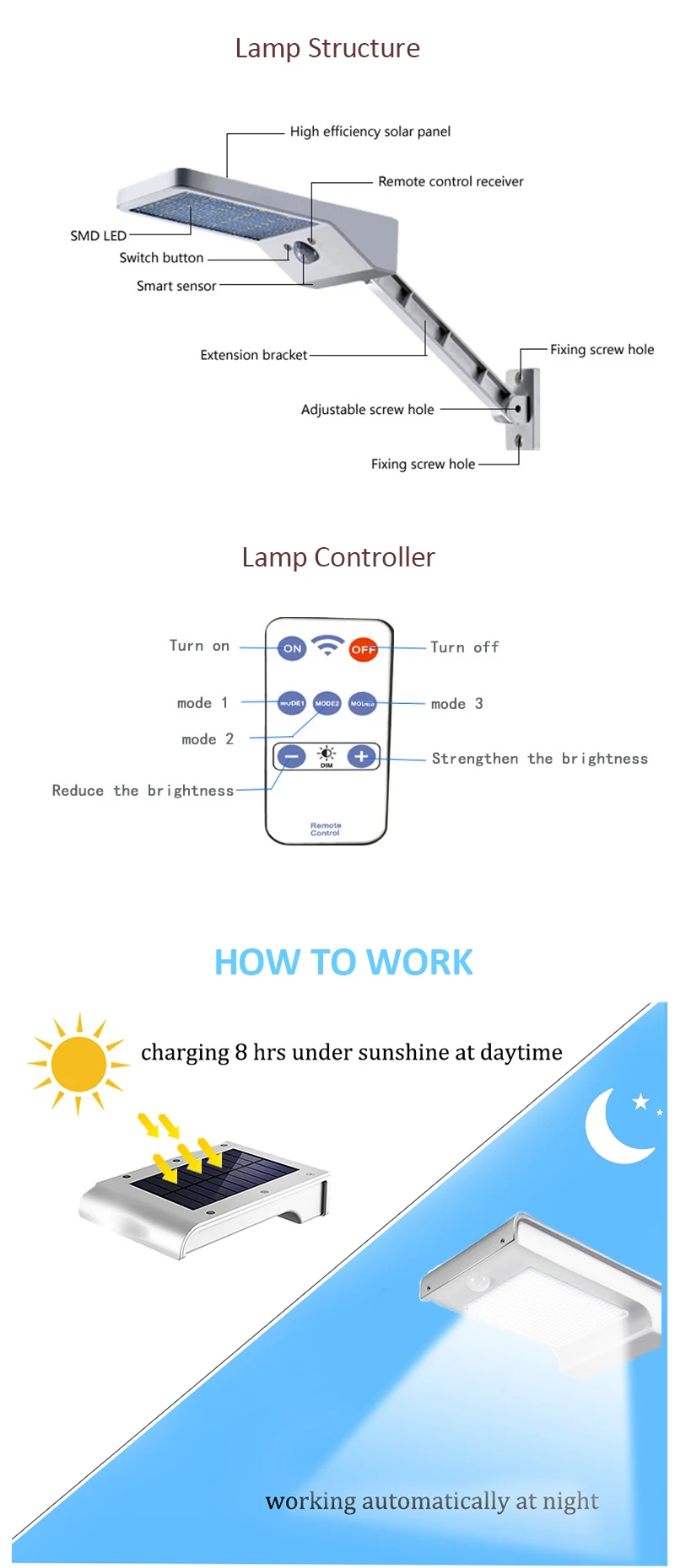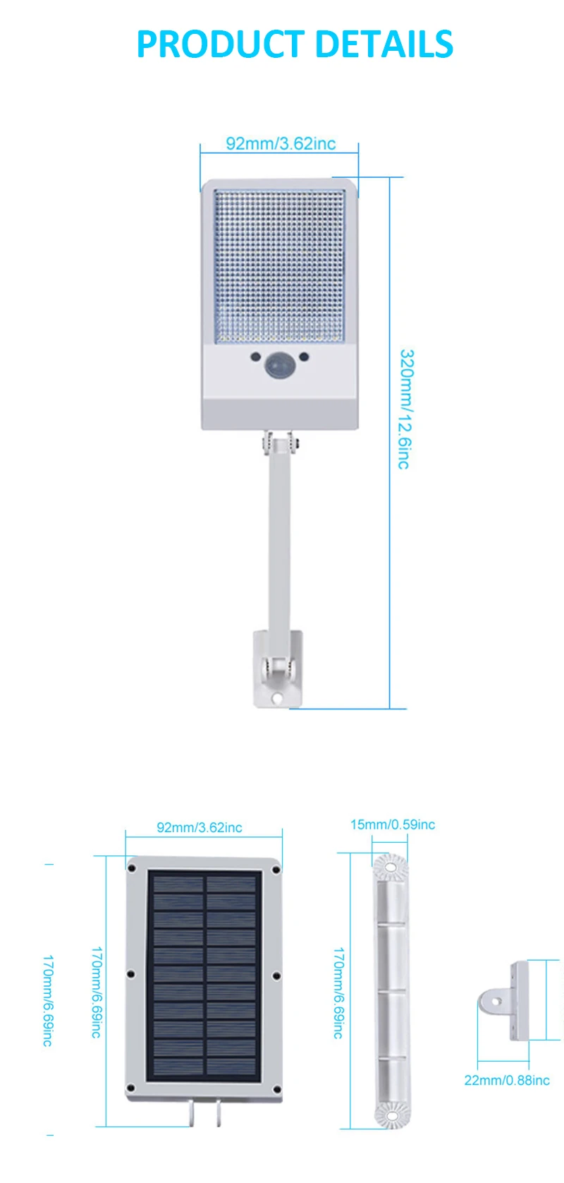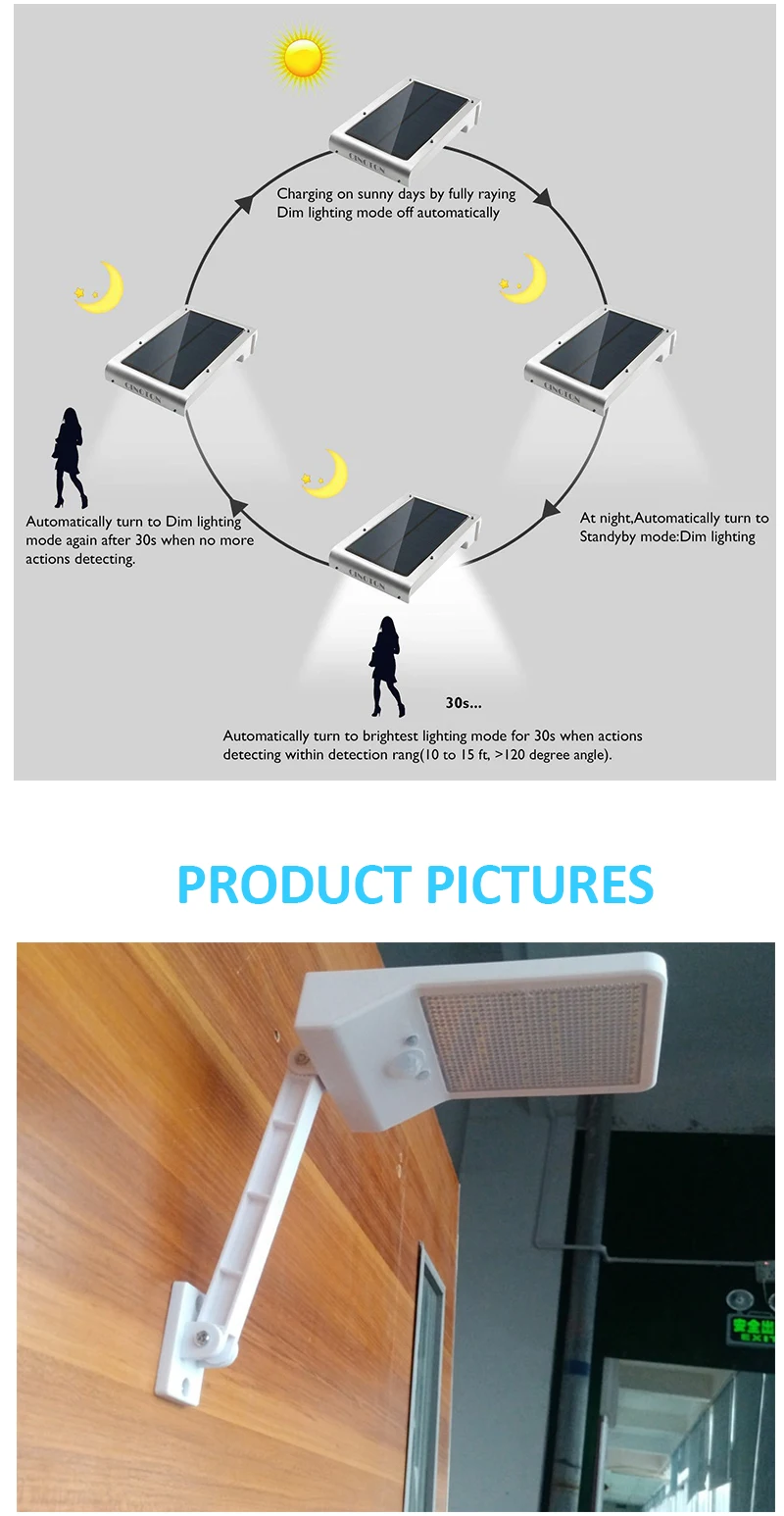 Этот вариант не имеет опорного стержня и контроллера, поддерживает солнечную зарядку и датчик движения PIR. Продукт 2:48 светодиодов солнечный светильник Этот вариант имеет опорный стержень и контроллер, поддерживает солнечную зарядку и датчик движения PIR. Продукт 1 и продукт 2: Источник питания: солнечная зарядка (энергосбережение) Материал корпуса: алюминиевый сплав + ABS Уровень защиты: IP65 водонепроницаемый Напряжение: 6 В