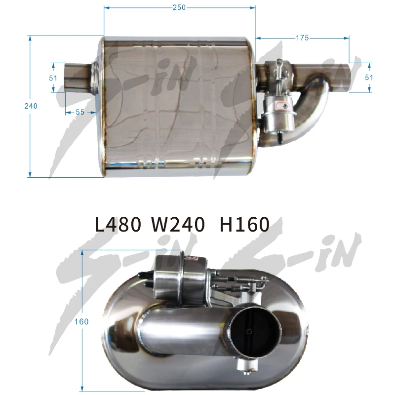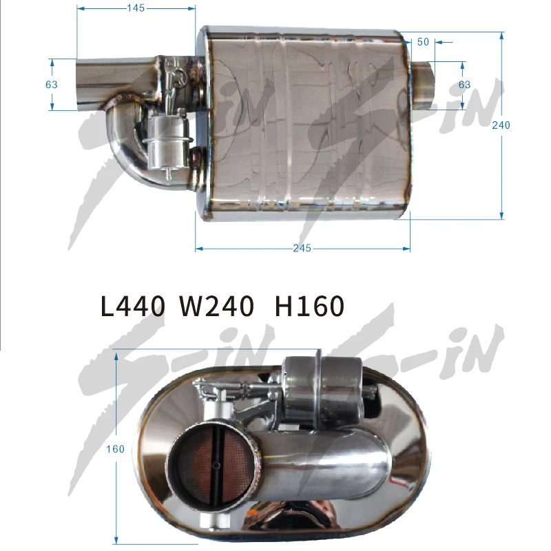 Размер клапана и соединительной трубы: 51 мм/2,0 дюйма 63 мм/2,5 дюйма 76 мм/3,0 дюйма Размер корпуса глушителя: 500*250*150 мм (длина * ширина * толщина)
