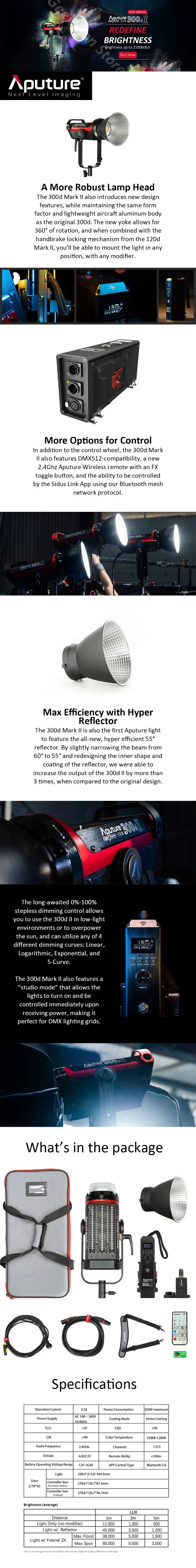 Построенный на основе популярного LS C300d, светильник Aputure Storm LS C300d Mark II Светодиодный светильник с v-образной панелью батареи-улучшенная версия с 20% большей мощностью, улучшенными характеристиками, И расширенное подключение. Aputure использует технологию Chip on Board (COB) для производства цветовой температуры 5500K с энергопотреблением всего 350 Вт, при выводе 3500 люкс светильник с эффективной отражатель на расстоянии 9,8». В дополнение к эффективности питания, этот прибор также имеет рейтинг CRI/TLCI 96, что указывает на точность цветопередачи. Балласт/контроллер приспособления использует от 0 до 100% линейный, логарифмический, геометрической и s-кривой затемнения и отделен от корпуса приспособления, что делает его легче и уменьшает его размер. Монтажное основание включено для использования с дополнительным зажимом, что позволяет прикрепить светильник к подставке для распределения веса.