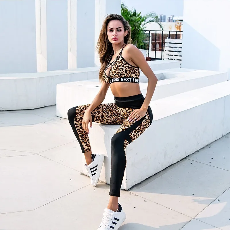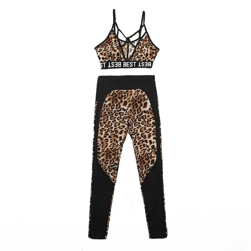 Спортивная одежда с леопардовым принтом, комплект для йоги, сексуальный спортивный костюм с бюстгальтером и штанами, открытая одежда для фитнеса, одежда для пробежки, танцев, тренажерного зала 2019, женский спортивный костюм