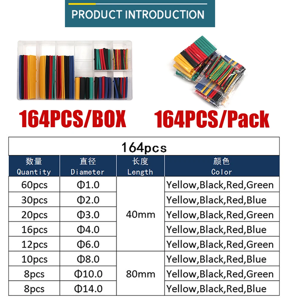 Внутренний диаметр: 1,0 мм, 2,0 мм, 3,0 мм, 4,0 ММ, 6,0 мм, 8,0 мм, 10,0 мм, 14,0 мм Утверждения: одобрение UL включает в себя: (Количество x внутренний диаметр x Одиночная длина) 60 шт. x 1,0 1,0x40 мм (желтый, черный, красный, зеленый) 30 шт. x 2,0 2,0x40 мм (желтый, черный, красный, синий) 16 шт. x 3,0 3,0x40 мм (желтый, черный, красный, зеленый) 16 шт. x 4,0 4,0x40 мм (желтый, черный, красный, синий) 16 шт. x 6,0 6,0x40 мм (желтый, черный, красный, зеленый) 10 шт. x 8,0 8,0x80 мм (желтый, черный, красный, синий) 8 шт. x 10,0 10,0x80 мм (желтый, черный, красный, зеленый) 8 шт. x 14.14,0x80 мм (желтый, черный, красный, синий) Посылка включает в себя: 164 шт х термоусадочная трубка