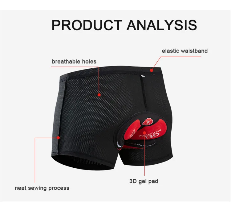 Это Велосипедное нижнее белье изготовлено из 80% полиэстера + 20% спандекса. Обладает высокой эластичностью для различных типов тела. Ткань имеет сквозное отверстие, гладкая и приятная для кожи, гладкая и дышащая. Гелевая подкладка изготовлена из толстой проветриваемой силиконовой подушки. Плотный, впитывающий влагу и дышащий материал для более комфортной езды.