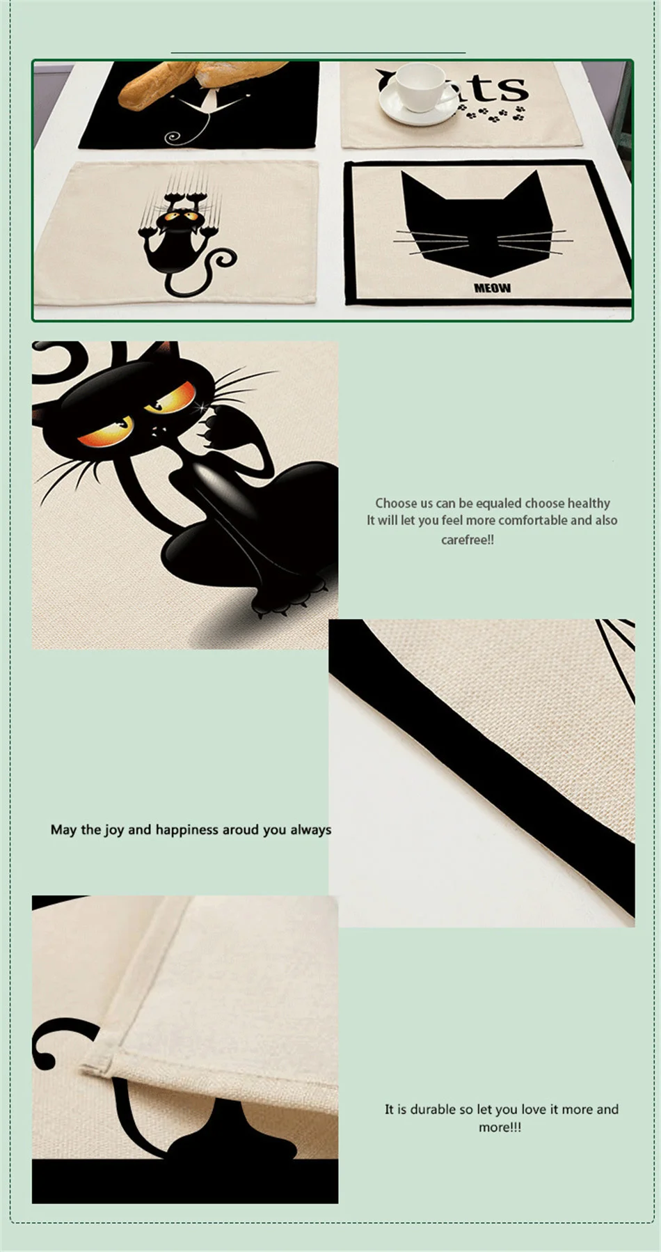 Черный с принтом кота, льняной Настольный коврик для домашнего использования, коврик для еды, посуда, коврик, шикарные милые столовые приборы для столовой, 1 шт.