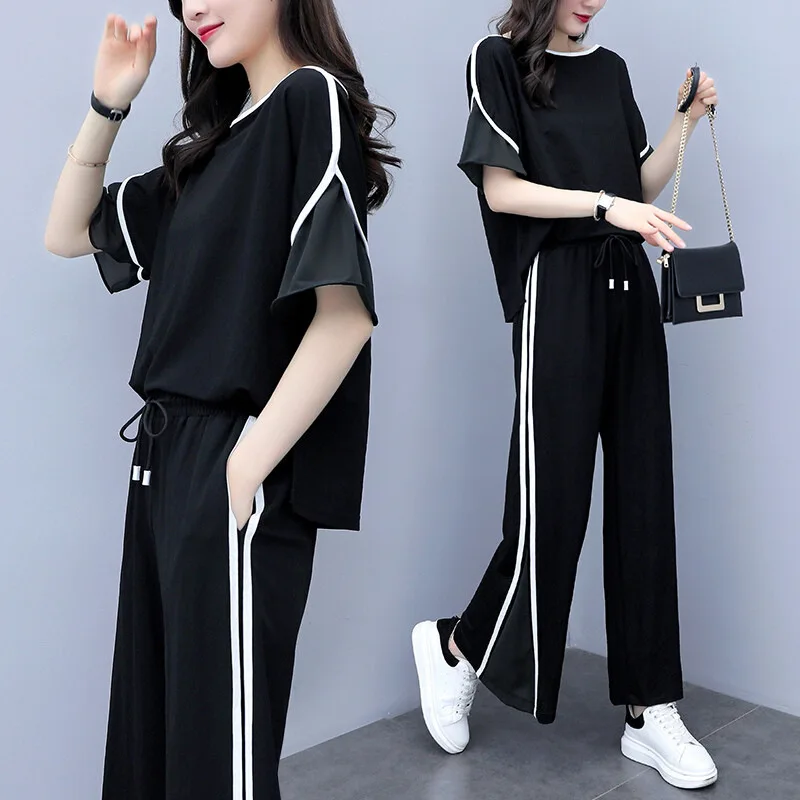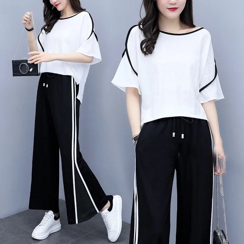 Женские шифоновые брючные костюмы, повседневные Формальные элегантные дамские брючные костюмы, летняя блузка, топ с широкими штанинами, комплект из 2 предметов, большие размеры XXXL 4XL