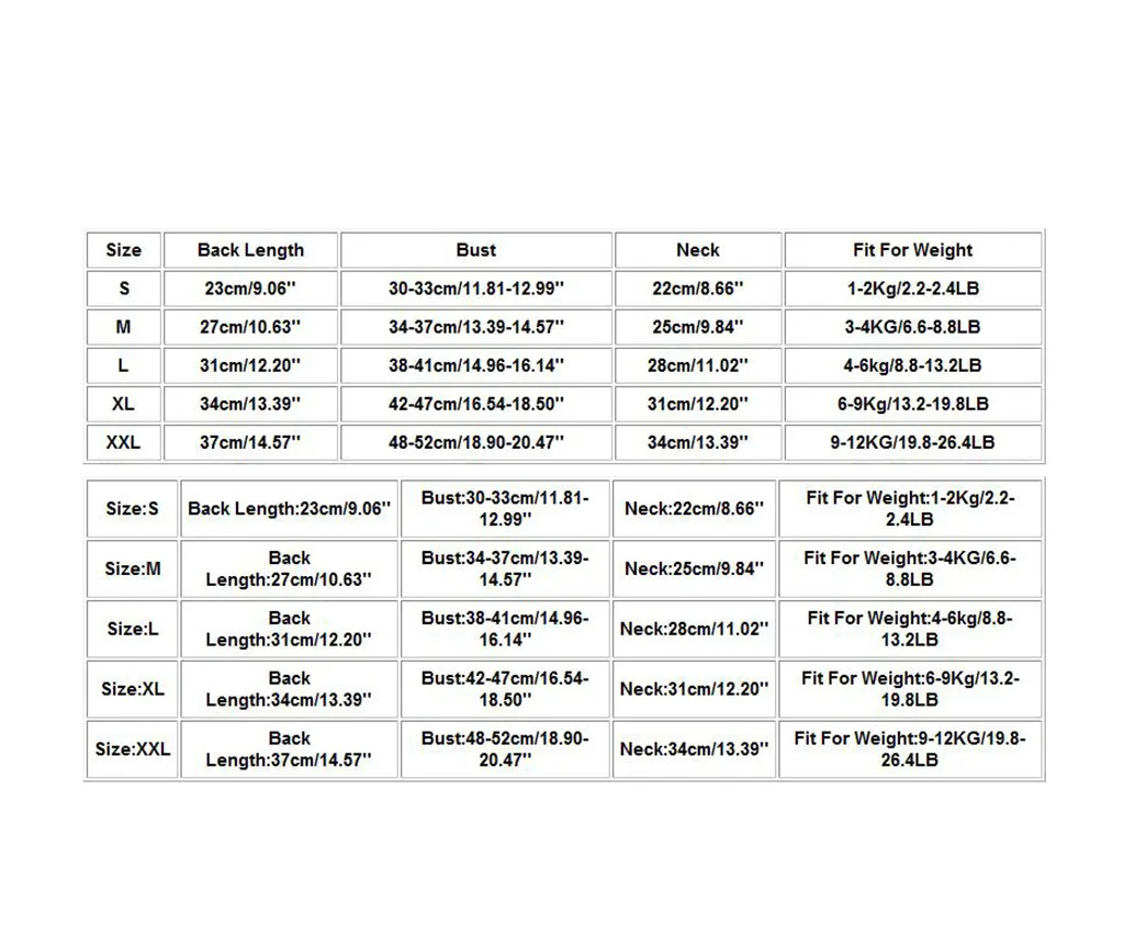 Размер Задняя Длина Обхват груди Шеи Подходит для Вес S 23 см/9,06'' 30-33 см/11,81-12,99'' 22 см/8,66'' 1-2 кг/2,2-2.4LB М 27 см/10,63'' Большие размеры 34-37 см/13,39-14,57'' 25 см/9,84'' 3-4 кг/6,6-8.8LB L 31 см/12,20'' Большие размеры 38-41 см/14,96-16,14'' 28 см/11,02'' 4-6 кг/8,8-13.2LB XL 34 см/13,39'' 42-47 см/16,54-18,50'' 31 см/12,20'' 6-9 кг/13,2-19.8LB XXL 37 см/14,57'' 48-52 см/18,90-20,47'' 34 см/13,39'' 9-12 кг/19,8-26.4LB