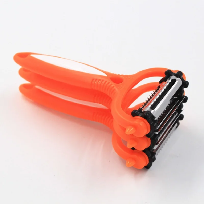 Это многофункциональная Овощечистка с вращающимися на 360 градусов лезвиями. Он имеет 3 вида лезвий, которые могут натереть еду в различные формы. Острые и выпуклые стороны можно использовать для очистки фруктов, таких как апельсин. Это идеальный инструмент для приготовления пищи для домохозяек.