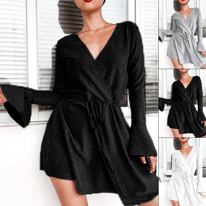 * Описание товара:Женская одежда, летняя мода свободный, сексуальный v-образный вырез, длинный рукав-колокол, мини-платье, пляжные Вечерние