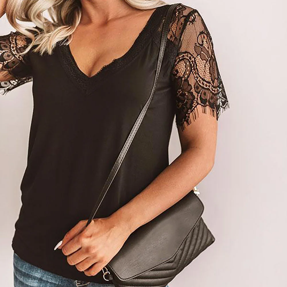* Описание товара: женские летние кружевные черные сексуальные новые Топы с v-образным вырезом и коротким рукавом