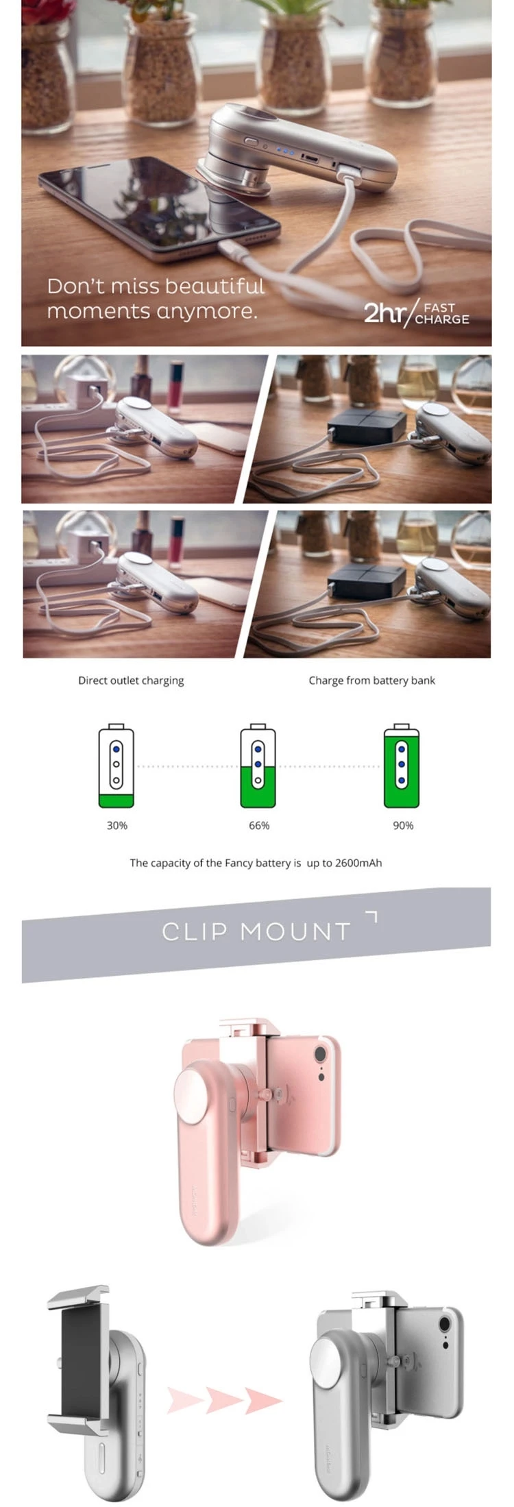 Необычные 1-переносной трехосный карданный стабилизатор для смартфона для шоу селфи видео Он fashion & smart 1 Ось портативный монопод с шарнирным замком имеет два режима съемки (Горизонтальная и вертикальная съемка) для различных случаев, поставляется со встроенным светодиодный дополнение светильник и большое зеркало, также может использоваться в качестве power bank. Особенности: Подходит для всех брендов смартфонов до 6 дюймов. Широко используется для различных случаев, таких как live show, selfie, reunite, создание видео, вечерние, путешествия и т. Д. Режимы съемки: горизонтальная съемка для создания; Вертикальная съемка для шоу в реальном времени. Встроенный светодиодный светильник: Очистите тени, светильник вашей красоты. Встроенное большое зеркало: макияж перед съемкой видео, показать лучшее. Стандартный интерфейс 1/4 "снизу, совместим с удлинителем, селфи-палкой, штативом и другим фотографическим оборудованием с винтовым креплением 1/4". Встроенный литиевый аккумулятор 2600 мАч, поддерживает 8 часов работы. Карданный стабилизатор также может использоваться в качестве банка мощности, заряжая ваши устройства через USB-порт. Портативный светильник: меньше, чем телефон (Размер: 113*43,5*23 мм), портативный, чем когда-либо (вес: всего 225 г). Технические характеристики: Модель: Нарядное Цвет: розовое золото, серебристый, черный, серый Диапазон: ± 45 ° Угол поворота 1 оси: 360 ° Аккумулятор: 4,2 в, 2600 мАч 18650 аккумулятор (встроенный) Зарядка: 5 В 1,5 А Выход USB: 5 В 1.5A Время работы: прибл. 8 часов Рабочая температура:-10℃ ~ + 40℃ Температура хранения: 5% ~ 95% (без глазури) Степень защиты: IP54 Сохранение температуры:-10℃ ~ + 60℃ Размер товара: 113*43,5*23 мм (без зажима для мобильного телефона) Вес изделия: 225 г/7,9 унций Посылка Размеры: 21,5*12,7*6,5 см/8,5*5 * 2.6in Вес посылка: 610 г/21,5 унций Посылка список: 1 * Wewow Fancy 1 Ось ручной смартфон Gimbal 1 * штангу 1 * USB кабель 1 * Руководство пользователя (английский, французский, немецкий, испанский, японский, китайский) Примечание: Смартфон в комплект не входит.