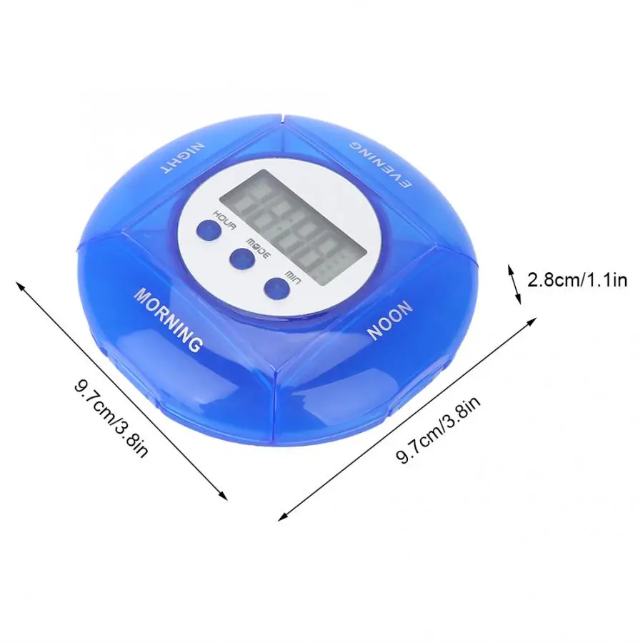 Изготовлен из пищевого АБС-материала, без БФА, без запаха, безвреден, хорошая прочность и устойчивость к коррозии. Конструкция четырех разделенных сеток легко различить таблетки в каждой дозе, не открывая крышки. Компактный и портативный, легко носить с собой, подходит для путешествий и активного отдыха. Умная коробка с напоминанием о времени, может установить 5 групп будильника, стандартное напоминание о том, чтобы принять лекарство. Устойчивость к царапинам и царапинам, герметичность пряжки делает лекарство не очень легким. Многофункциональный, также может использоваться в качестве ювелирных изделий, конфет и т. Д.