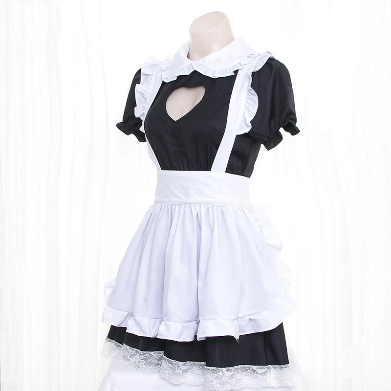 Один размер: длина юбки 83 см, ширина плеч 34 см, обхват груди 90 см, обхват талии 54-81 см, длина рукава 20 см, длина фартука 67 см