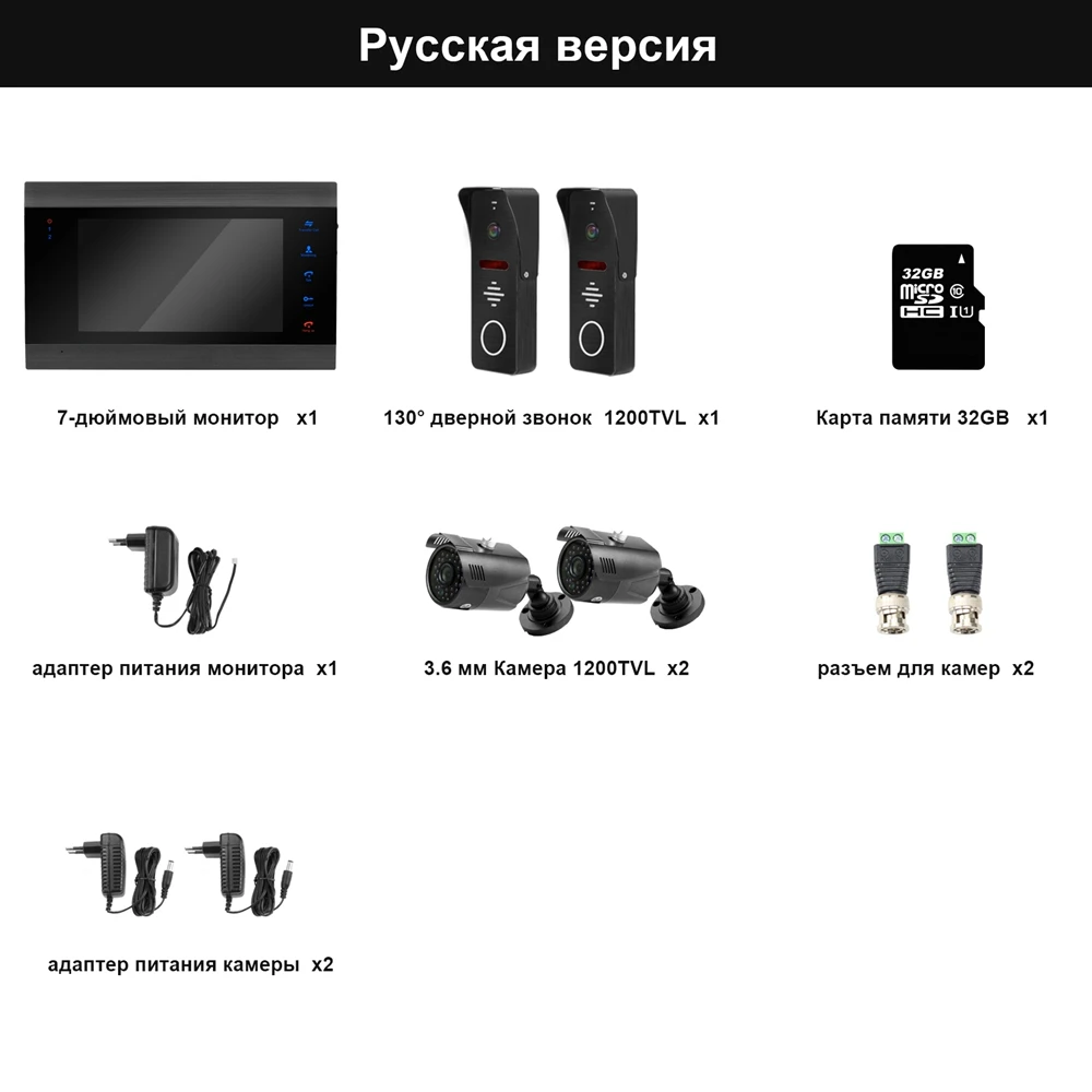 Монитор x1 Дверной звонок x2 Камера x2 32GB x1 Если вам нужно удлинить кабели, пожалуйста, свяжитесь со мной