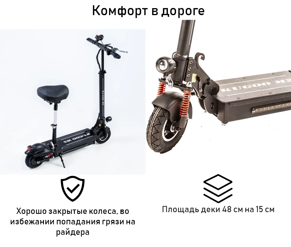 В модели KUGOO M2 появилось комфортное для водителей сиденье. Теперь пользователь может использовать электросамокат для дальних поездок, как полноценное портативное транспортное средство.