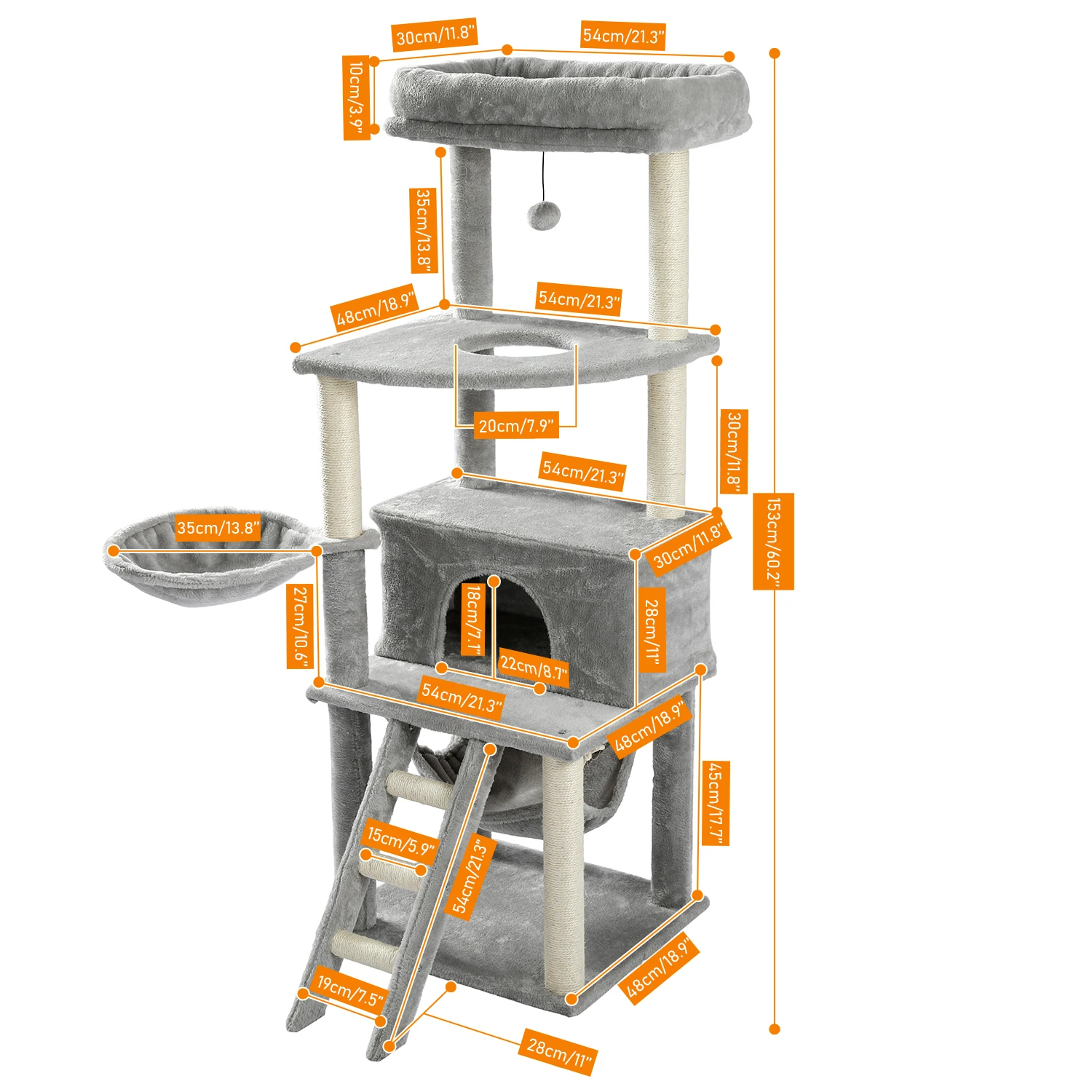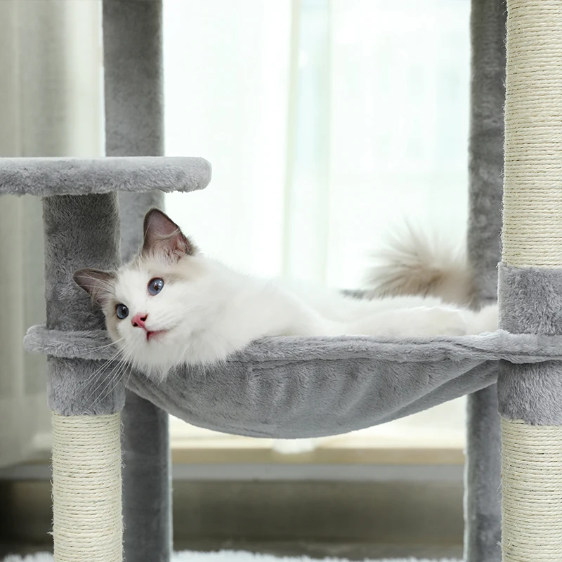 ·Многоуровневый центр активного дерева для кошек: это высокое дерево для кошек-специально разработанный центр отдыха для кошек, котят. Уютное просторное Кондо достаточно большое для 2-3 кошек, также укрытие для кошачьих отдыхов, игр и растяжек. Окунь флеш подходит для крупных кошек, глубокий гамак идеально подходит для скручивания внутри во время царапания на когтеточке из сизаля. Эта универсальная башня с кошачьим деревом сочетает в себе функциональность и стиль, что позволит кошке стать замком для ваших пушистых друзей
