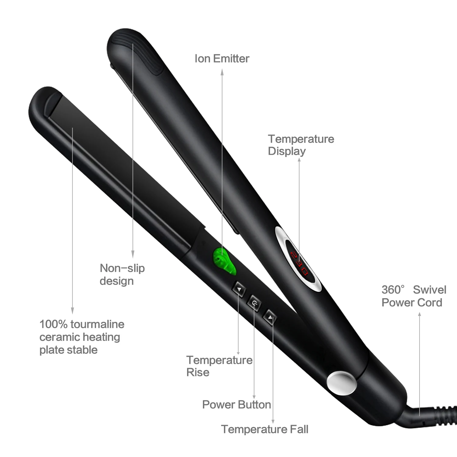"Напряжение: 110-220 В (глобальное Универсальное напряжение) Частота: 50/60 Гц Мощность: 50 Вт Температура: PTC Материал теплового проводника: турмалиновая керамика Диаметр теплопроводности: 16 мм-20 мм Регулировка температуры и эффективности: Светодиодный контроль температуры на цифровом дисплее, 320 °F,360 °F,390 °F,430 °F,460 °F. Длина линии: около 2 м С функцией блокировки, вращающийся на 360 градусов шнур питания."