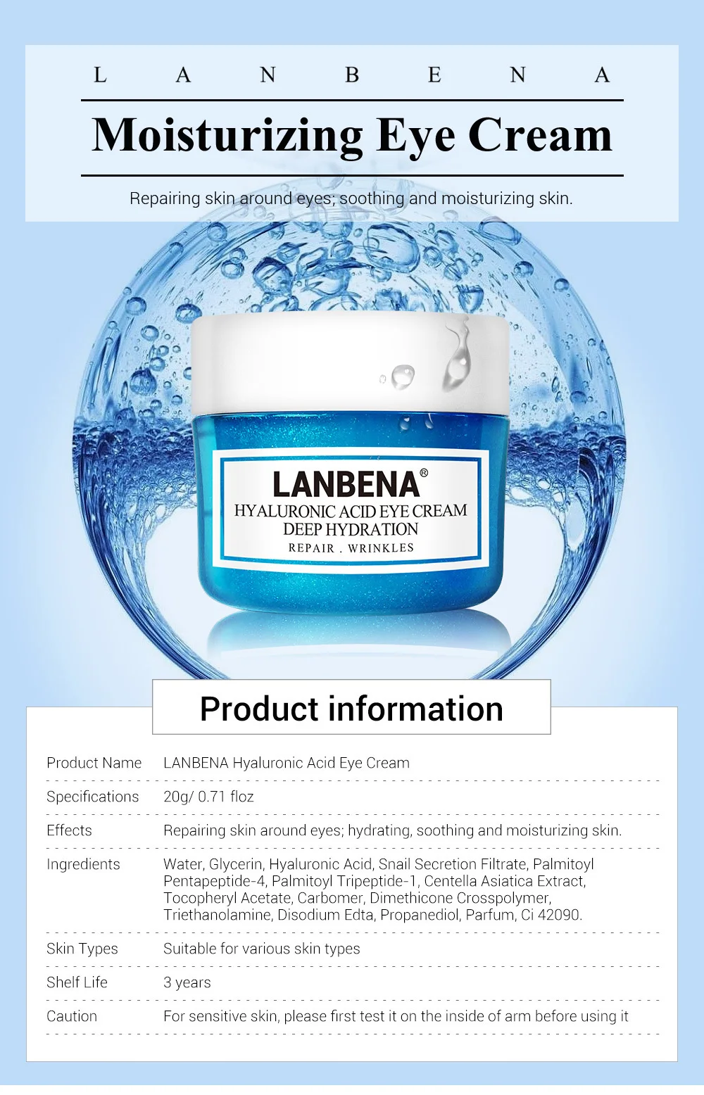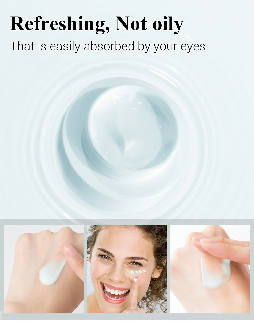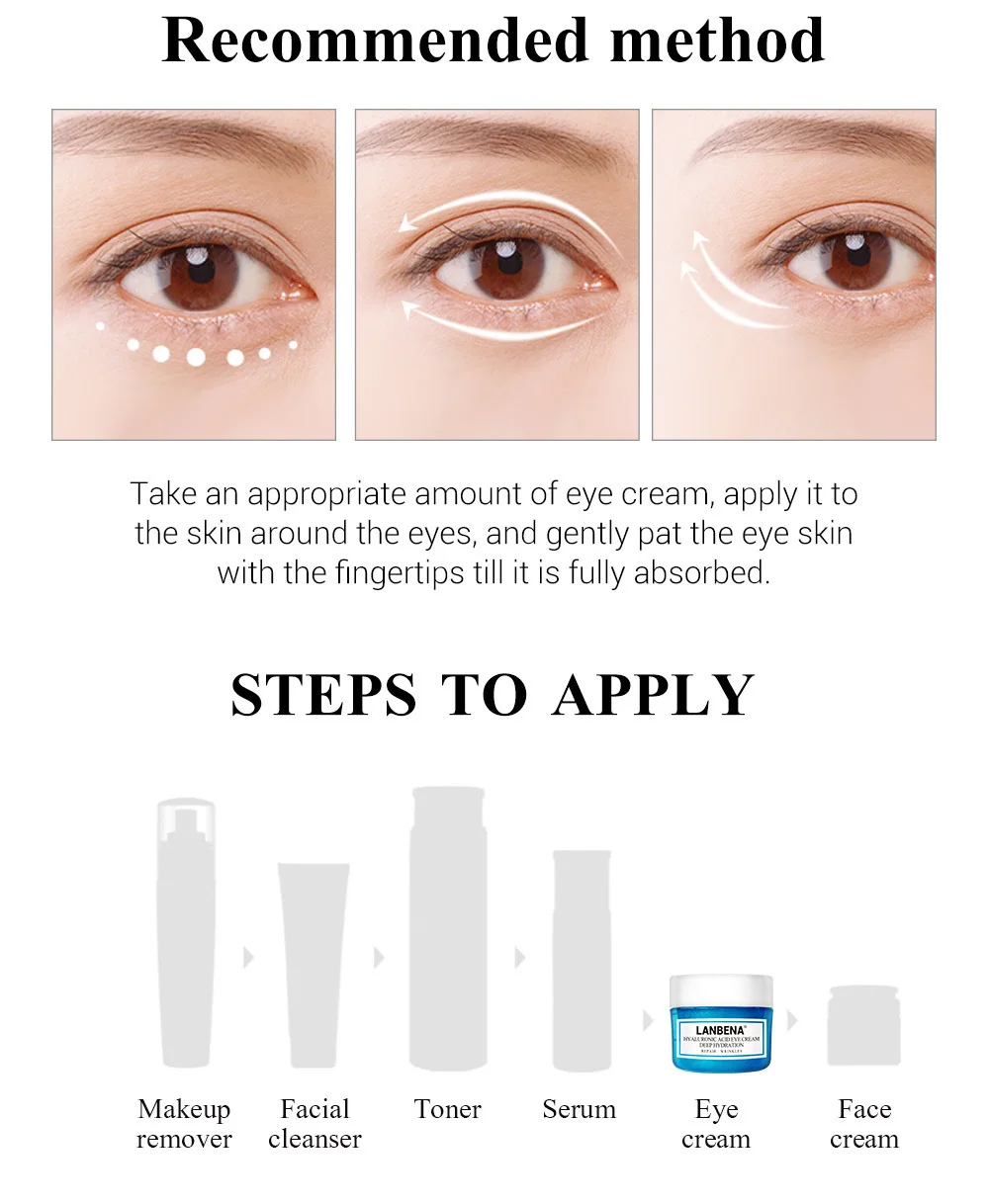 Рекомендуемый метод: Возьмите соответствующее количество крема для глаз, нанесите его на кожу вокруг глаз и аккуратно погладьте кожу глаз кончиками пальцев до полного впитывания.