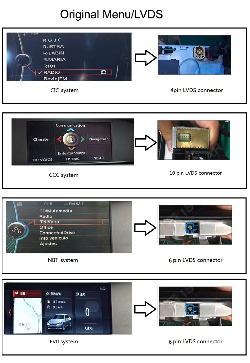 2. Прежде чем сделать заказ, пожалуйста, проверьте оригинальный стиль меню экрана и разъем LVDS, чтобы подтвердить оригинальную систему автомобиля