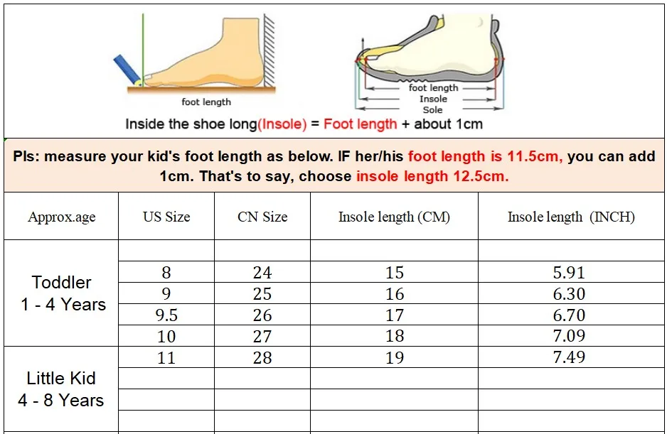 5. Что касается размера, Измерьте длину стопы ребенка в см или дюймах + 1 см или 0,03937 дюймаChВыберите соответствующий американский размер, спасибо