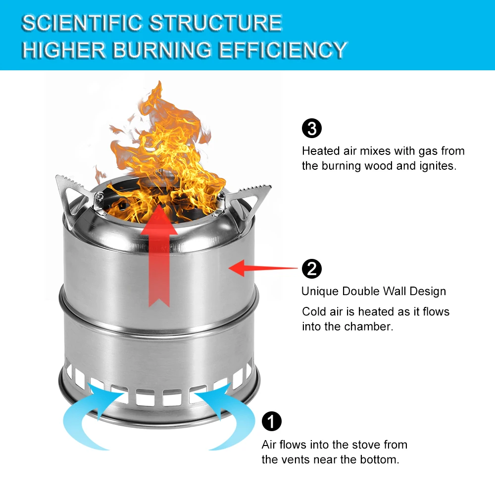 Эта Складная кемпинговая дровяная печь является обязательным предметом для всех, кто серьезно относится к активному отдыху. Прочная конструкция из нержавеющей стали с противоскользящей подставкой для кастрюль обеспечивает стабильную и безопасную поддержку посуды. Конструкция с двойными стенками и вентиляционные отверстия улучшают циркуляцию воздуха и эффективность горения. Он складной и легкий, его очень удобно носить с собой, куда бы вы ни отправились. С этой компактной плитой в рюкзаке вы никогда не будете беспокоиться об израсходованных топливах, просто готовьте еду с веточками, листьями и ветками, которые вы собираете из природы, что не вызовет химических выбросов.