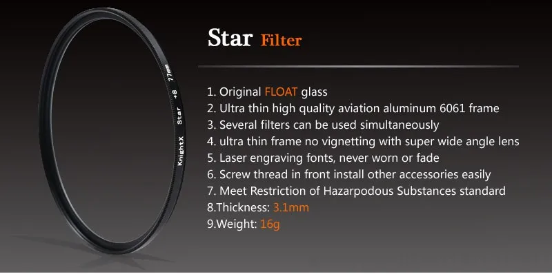 Звездный фильтр Звездный фильтр, или фильтр поперечного экрана, создает звездный узор, при котором линии излучаются наружу от ярких предметов. Звездный фильтр добавляет драматический перекрестный вспыш очень ярких зон.Для фотографий ночной сцены и дам, носящих ювелирные изделия или другие предметы с сильным отражением.Спецификация: высококачественное Оптическое стекло для цифровой камеры служит для добавления Особых Эффектов на цифровую фотографию, добавляя драматический восьмикрестообразный вспыш очень ярких областей, Дающий Мягкий фокус эффект отлично подходит для фотографирования украшений, кристаллов, свечей или других световых спецэффектов Данный фильтр имеет один слой покрытия, нанесенного на обе поверхности для подавления отражения и увеличения светопропусканияИдеально подходит для фотографирования дам, носящих украшения, или для создания ослепительного эффекта, усиливающего сильные отблески от предметов Материал: оптическое стекло