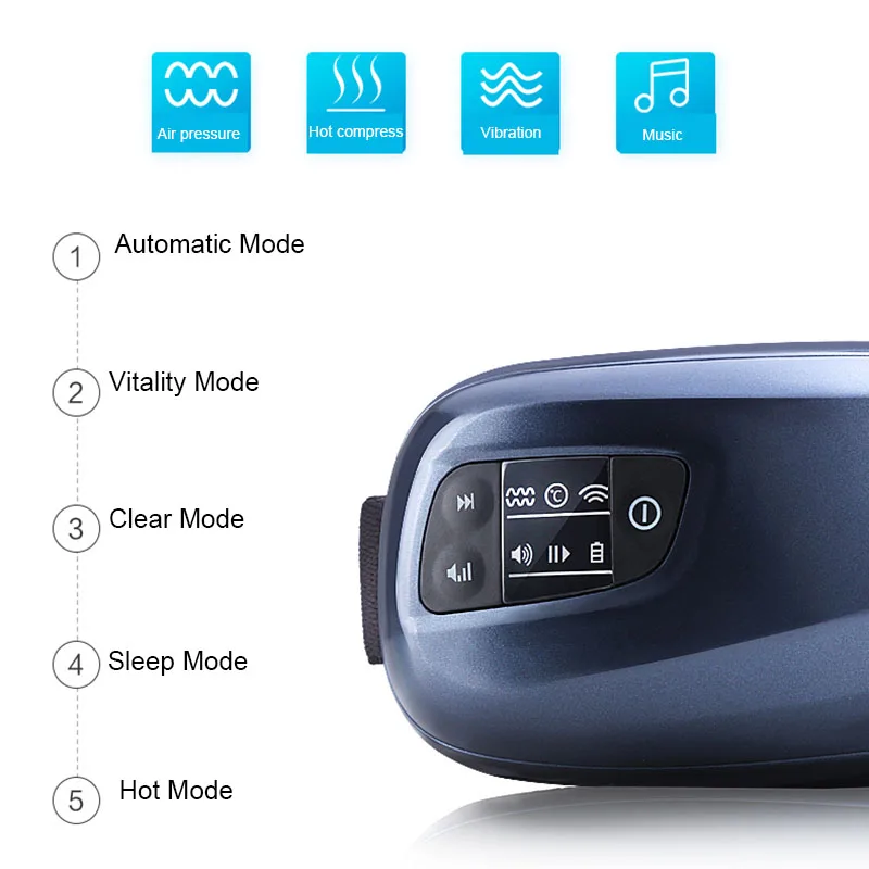 Одно давление воздуха, горячий компресс, вибрация, музыка Два давления воздуха, вибрация, музыка Три давления воздуха, вибрация, нагрев Четыре воздушных давления + музыка Пять Горячих компрессов + музыка