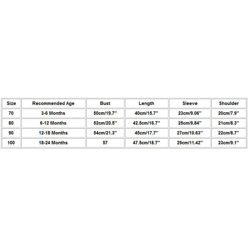 Размер Рекомендуемый возраст Бюст Длина Рукав Плечо 70 3-6 месяцев 50 см/19,7'' 40 см/15,7'' 23 см/9,06'' 20 см/7,9 дюйма 80 6-12 месяцев 52 см/20,5 дюйма 42,5 см/16,7'' 25 см/9,84'' 21 см/8,3'' 90 12-18 месяцев 54 см/21,3'' 45 см/17,7'' 27 см/10,63'' 22 см/8,7'' 100 18-24 месяцев 57 47,5 см/18,7'' 29 см/11,42'' 23 см/9,1 дюйма