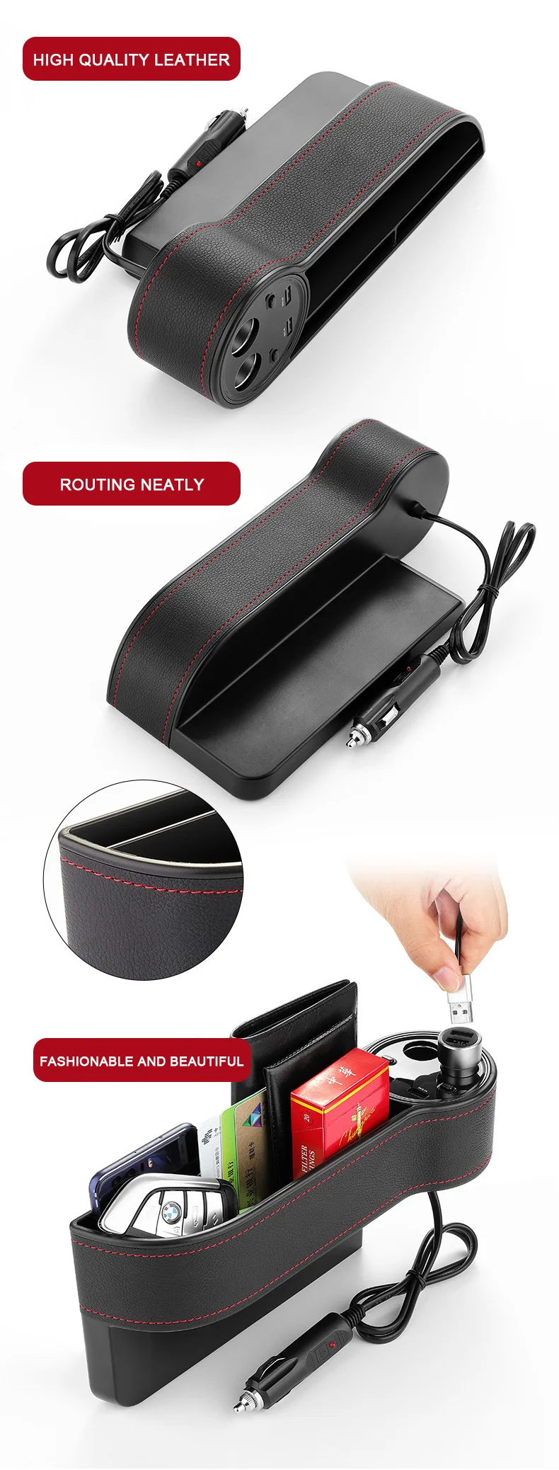 1. Большое пространство для хранения 2. Хороший материал, без запаха 3. Высококачественная кожа 4. Предупреждение о высоком напряжении 5. Двойная зарядка через USB 6. Двойной точечный дымоход-независимый переключатель 7. Смарт-чип 8. Жирный провод, стабильность тока