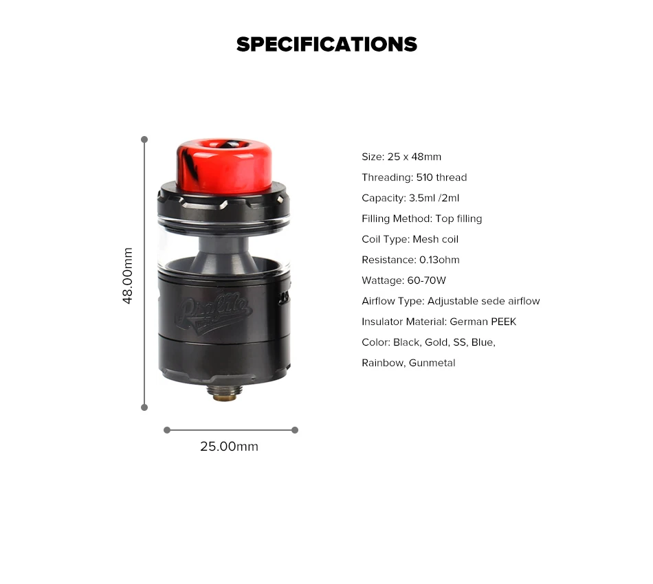 Diameter: 25mm Overall Height: 48.5mm Threading: 510 thread E-liquid Capacity: 3.5ml (5ml tube included) Filling Method: Top filling Coil Type: Mesh coil Airflow Type: Adjustable side airflow Insulator Material: German PEEK
