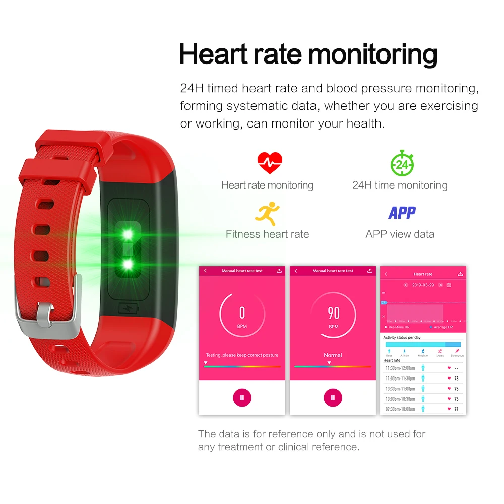 Heart rate and blood pressure monitoring monitor your heart rate and blood pressure every 30 minute and save the data in the APP. (the data is for reference only and can not be used for treatment and clinical reference