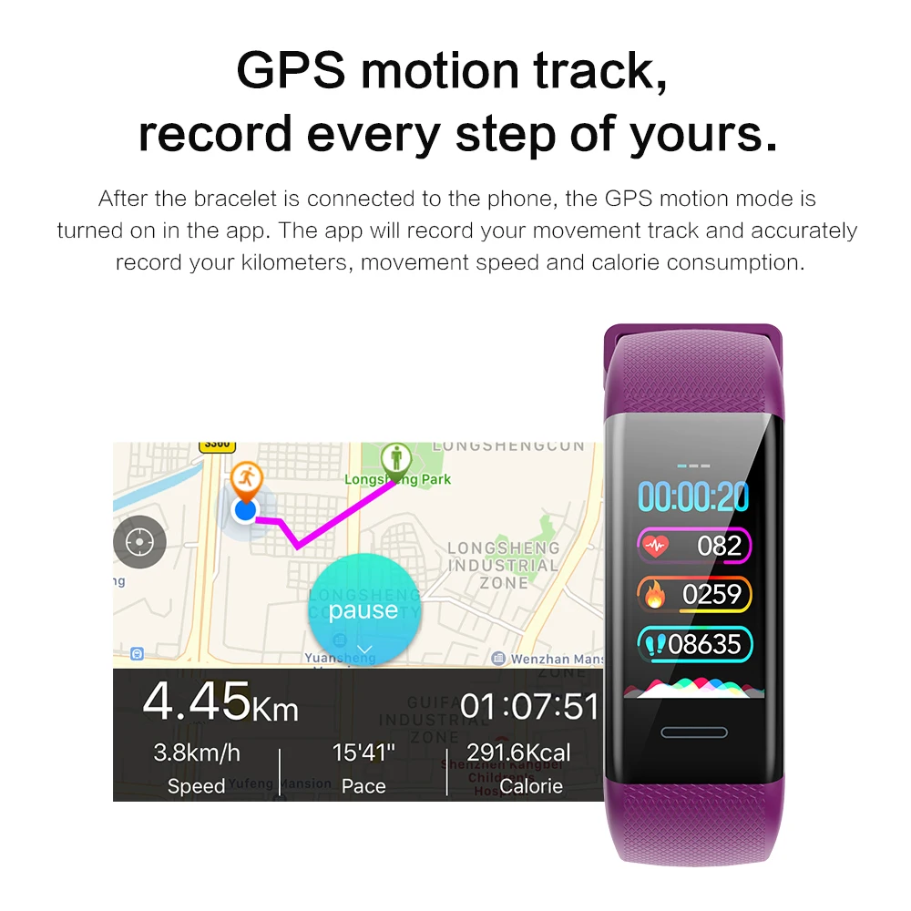 GPS trajectory track, record every step of yours after connected to the mobile, the GPS motion mode is turn on in the APP. The APP will record your movement trajectory and accurately record your mileage, Speed, and calories consumption