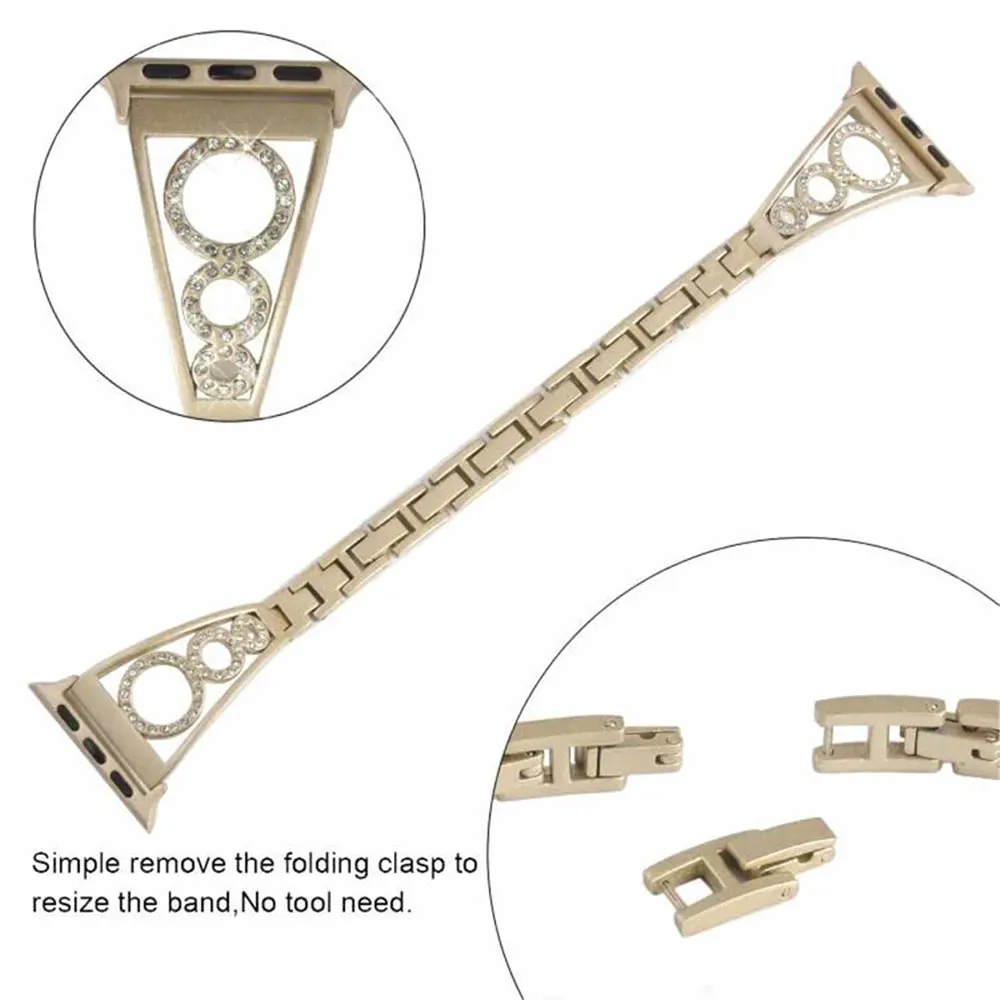 Особенности: 1. Подходит для всех версий Apple Watch серии 1 2 3 38 мм или 42 мм/серии 4 40 мм или 44 мм 2. Стильный роскошный дизайн, сделает ваши часы Apple более красивыми и привлекательными 3. Цвета: черный, серебристый, винтажное золото, розовый 4. Материал ремешка: высококачественный сплав, металл, стразы и нержавеющая сталь 5. Легко регулировать длину ремешка, просто снимите складную застежку, чтобы изменить размер ремешка, не требуется инструмент 6. Размер запястья: 5,9 "-8,1"(150-205 мм) Посылка включает в себя: 1x Ремешок для часов с адаптерами (часы не входят в комплект)