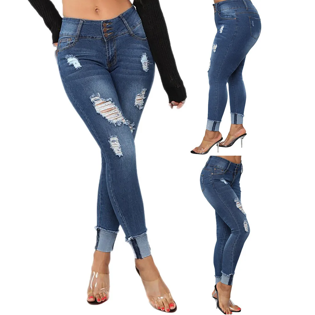 2019Женские Эластичные большого размера с джинсовым карманомПовседневные джинсы с перфорацией