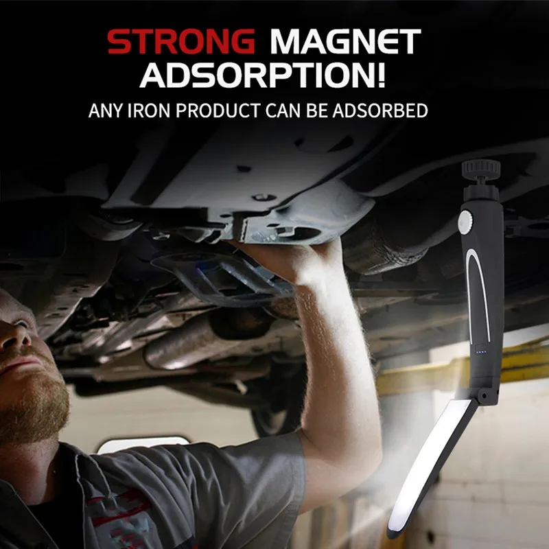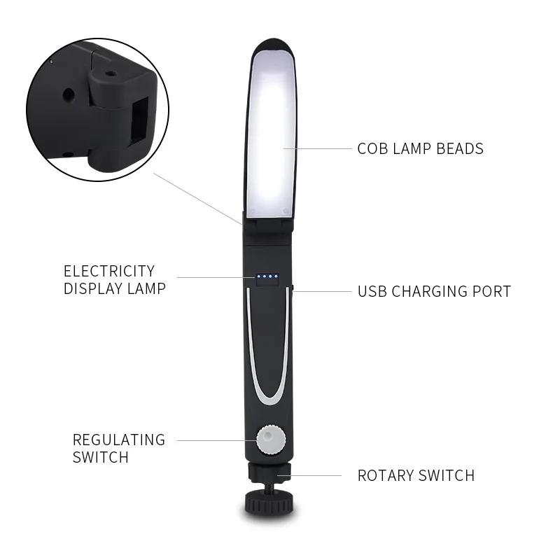 Features: 1. Folding design, 360° rotation. Easy to carry, it can be used on ferrous metal surfaces. 2. Green energy saving and environmental protection. 3. Built-in rechargeable lithium battery, charging with USB power cord. 4. Available USB charger, car charger, mobile power, computer USB for charging. 5. Suitable for vehicle maintenance, workshop maintenance, outdoor activities, emergency lighting, etc.