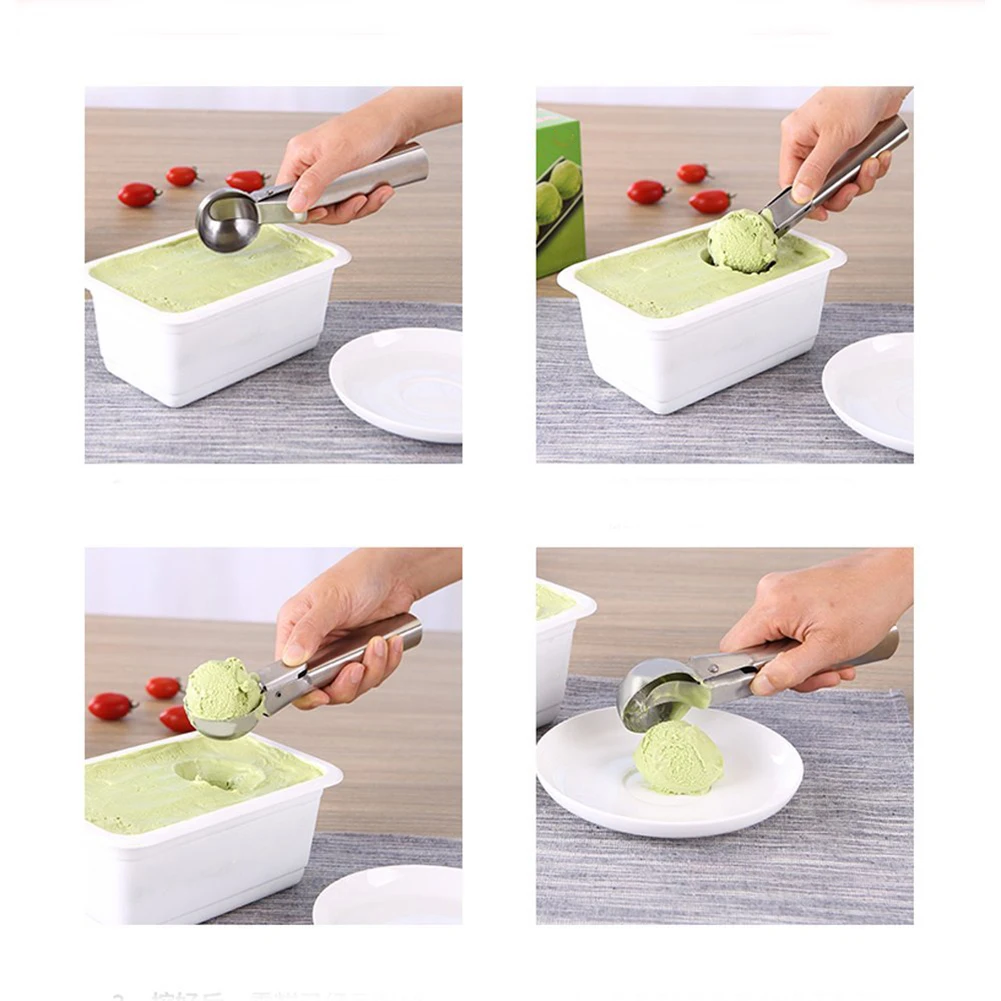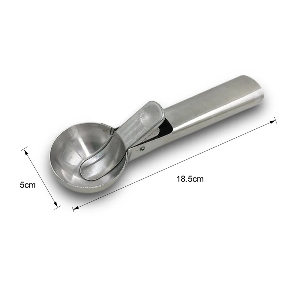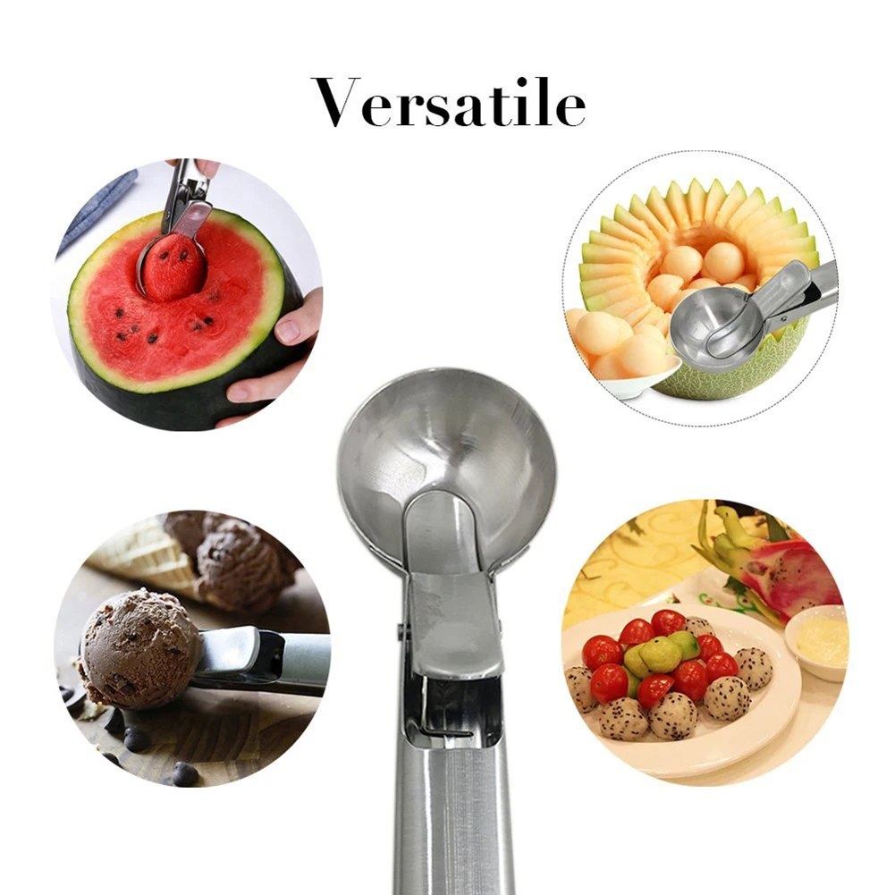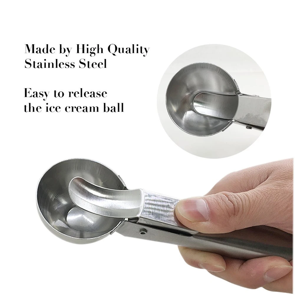Материал из нержавеющей стали, изысканный и прочный. С помощью триггера вы можете легко выпустить шарики для мороженого. Просто одно простое нажатие. Посудомоечная машина безопасна, и вам легко чистить совок. Универсальный: не только для мороженого, но и используется для арбуза и других фруктов.
