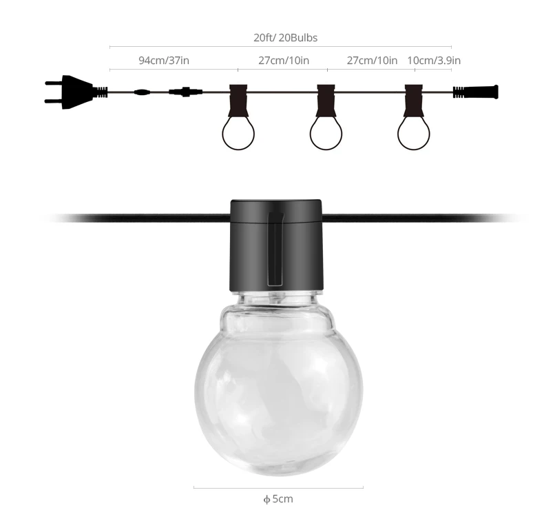 Оснащенный 20 глобальных светильник ламп на 5 м, эта строка светильник издает ярко-желтое свечение на задних дворов, беседок, садов, пергол, палуб, городских крыш, держащих букет невесты на свадьбе, званых обедов, вечеринок по случаю Дня рождения, посиделки мгновенно приподнимают светильник в романтическом, но праздничном стиле.