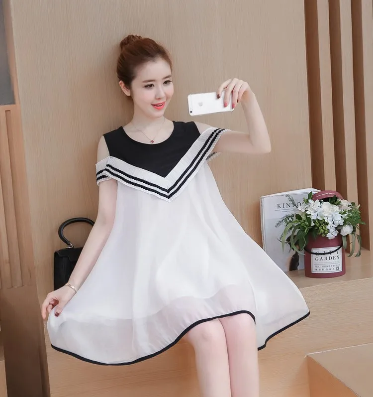 Летние платья для беременных с открытыми плечами трапециевидной формы, черно-белое платье для беременных, Одежда для беременных женщин, простое стильное платье